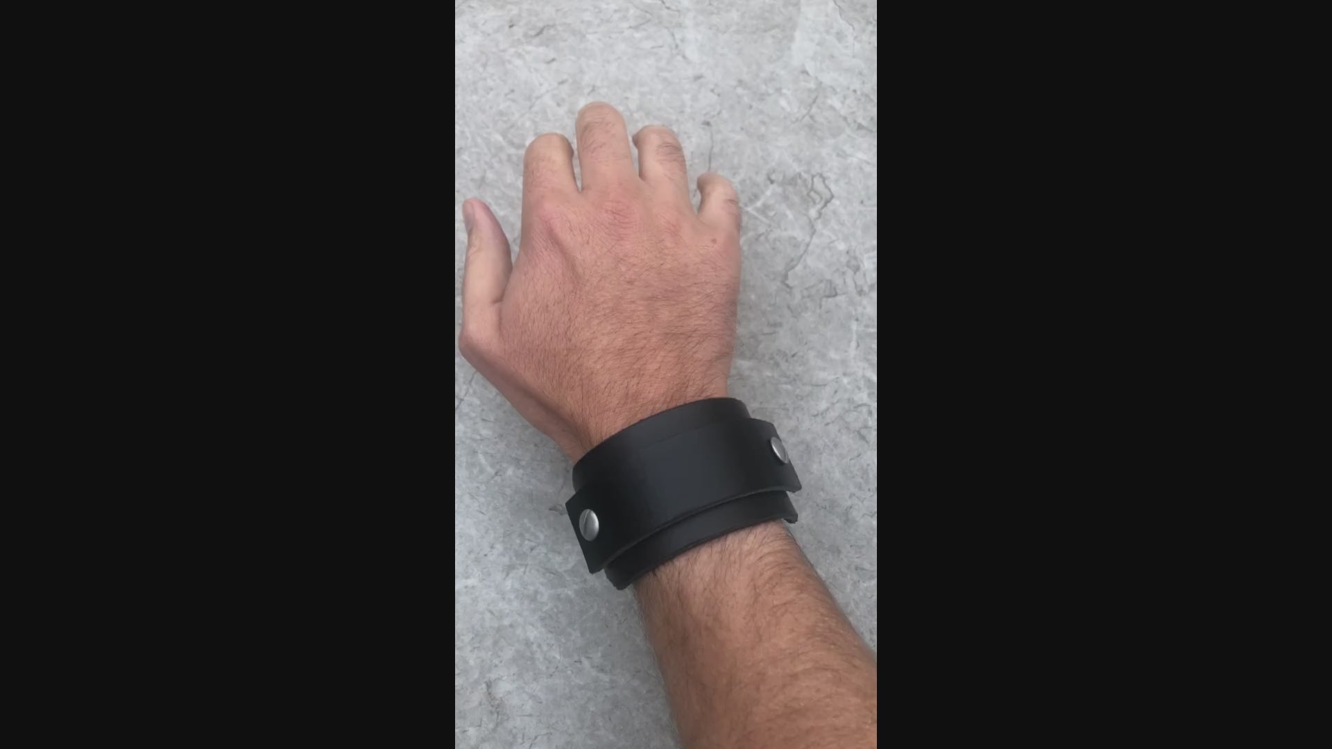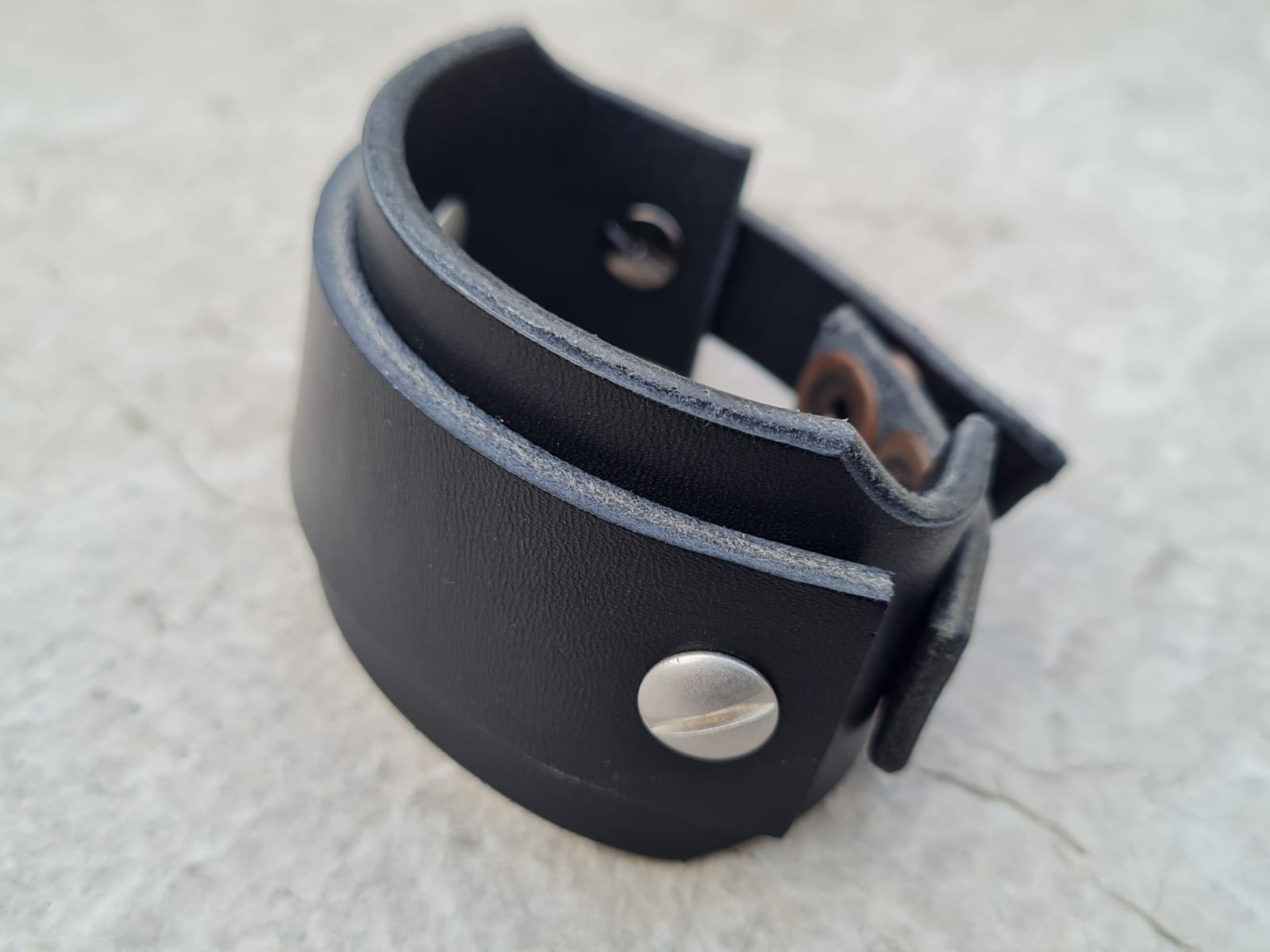 Black Leather Wristband / Bracelet - Minimal chunky style wristband. Handcrafted using premium full grain vegetable tanned Italian leather, solid brass chicago screws (matt nickel finish) and snap fasteners (antique brass finish). The leather is extra thick at 3.5mm for a rugged look and feel. Edges hand burnished with bees wax for a smooth finish.