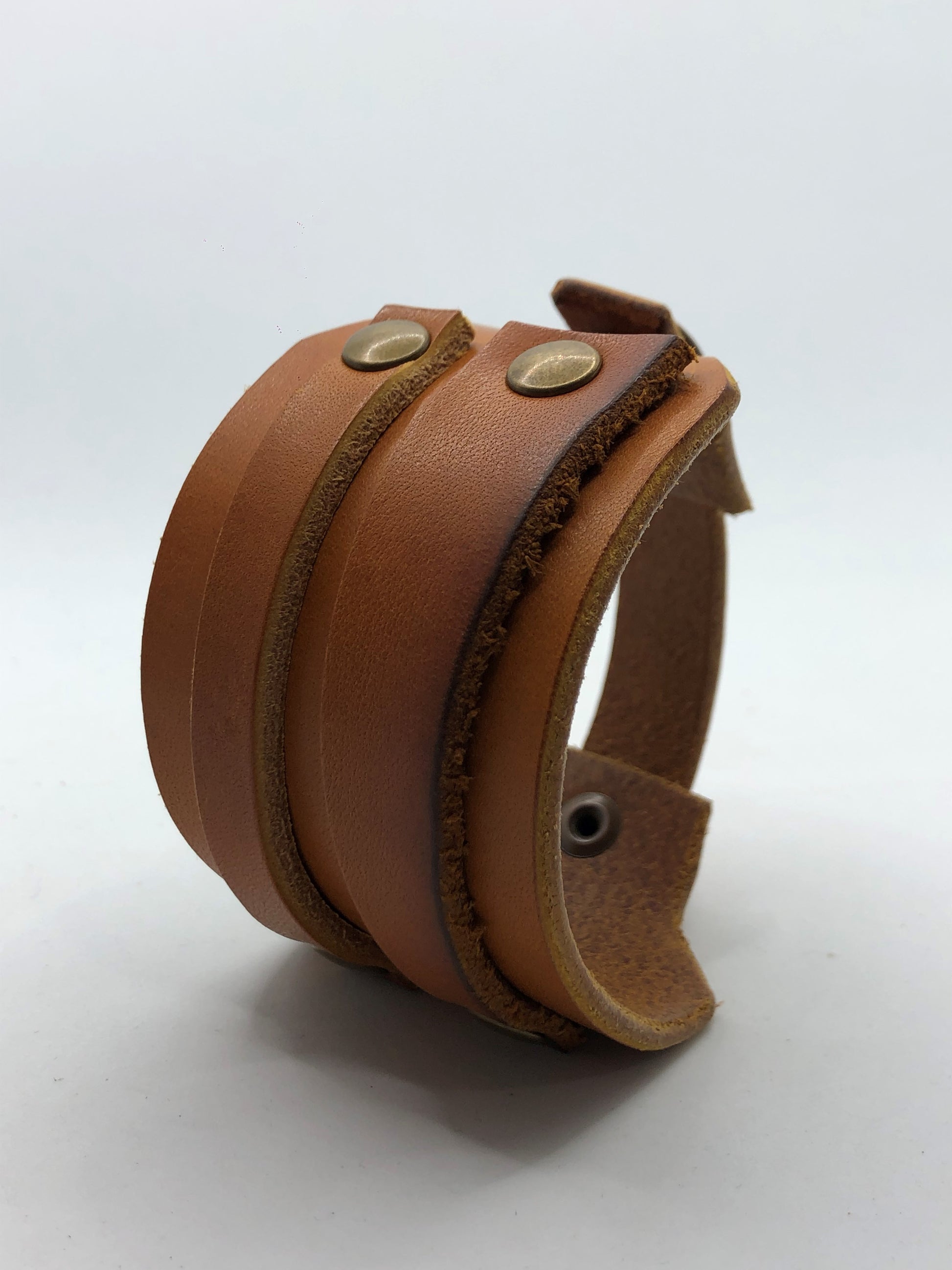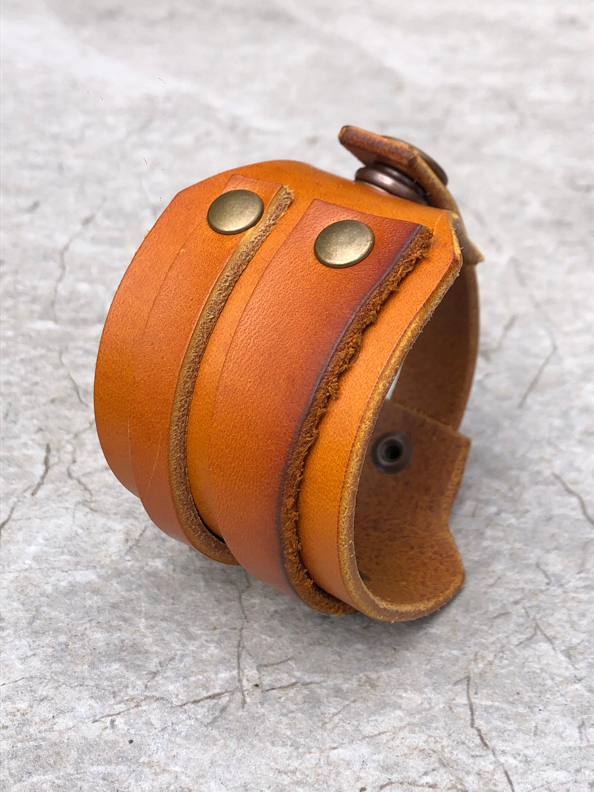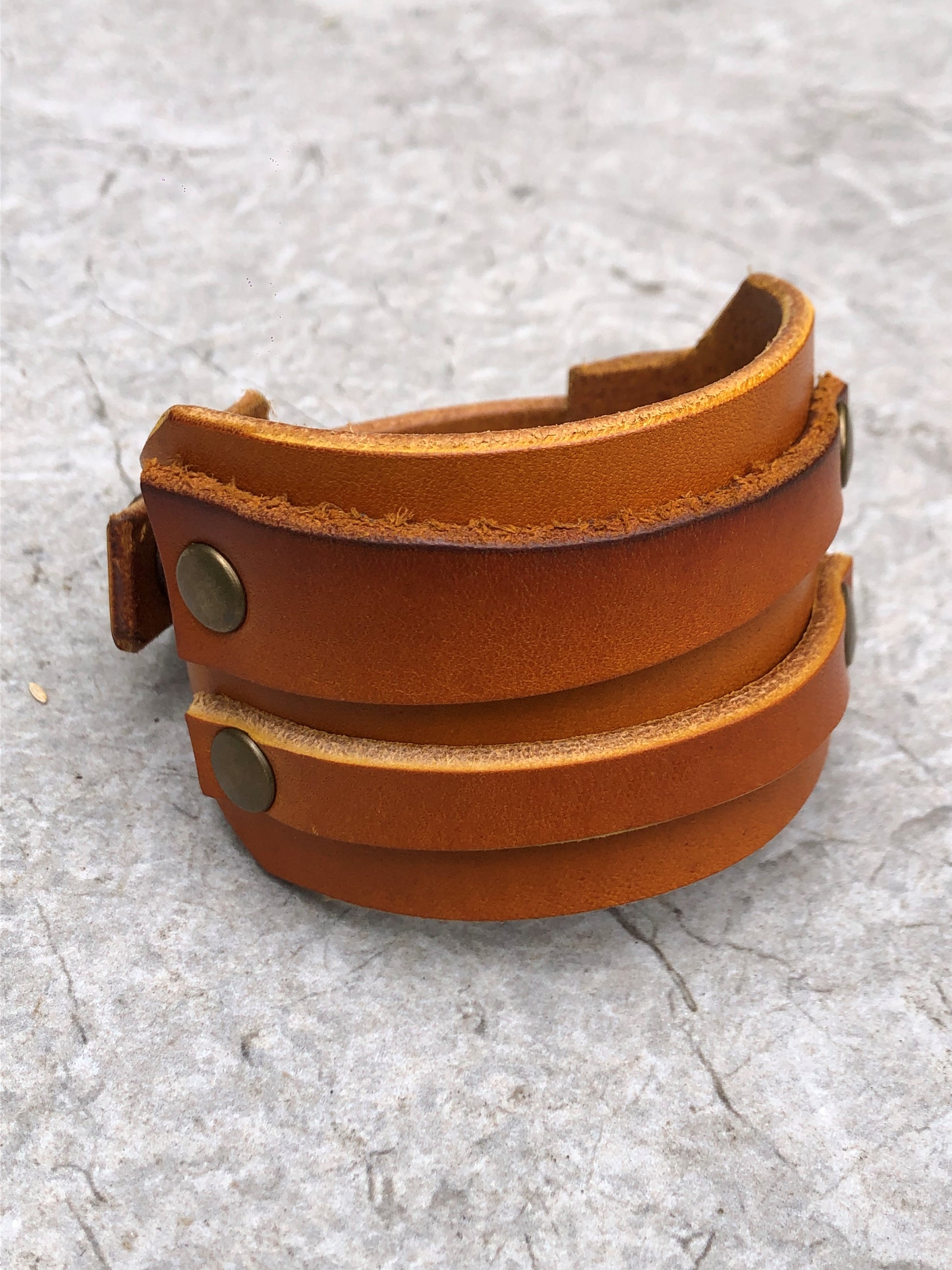 Achilles - Distressed Leather Cuff / Bracelet in Golden Tan. Handmade with premium full grain vegetable tanned Italian leather, solid brass rivets and snap fasteners (antique brass finish). The Edges are hand burnished with bees wax for a smooth finish. This piece features top layer straps with the edges left intentionally unfinished for an edgy / distressed look.