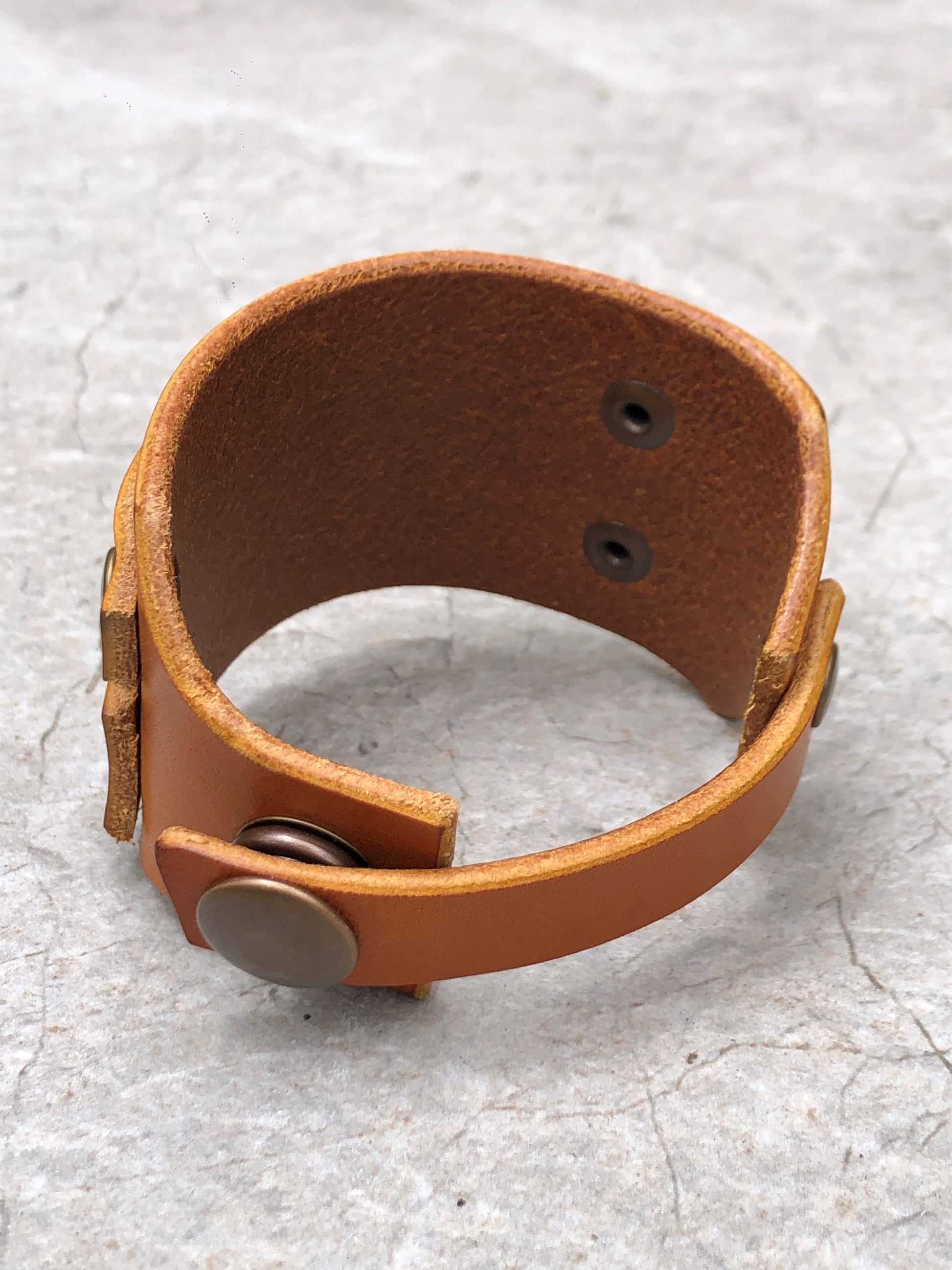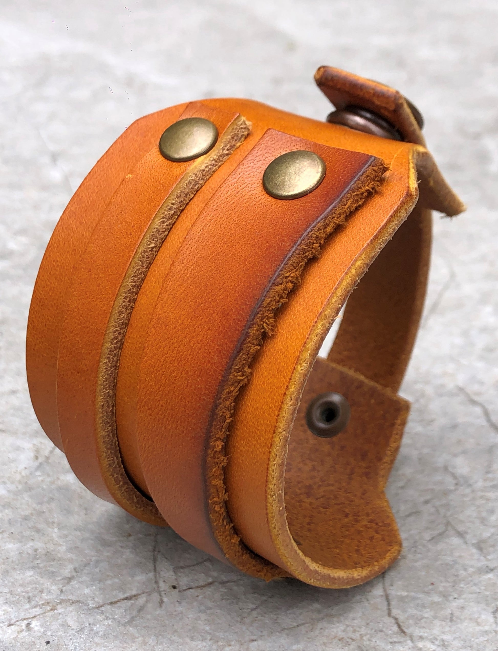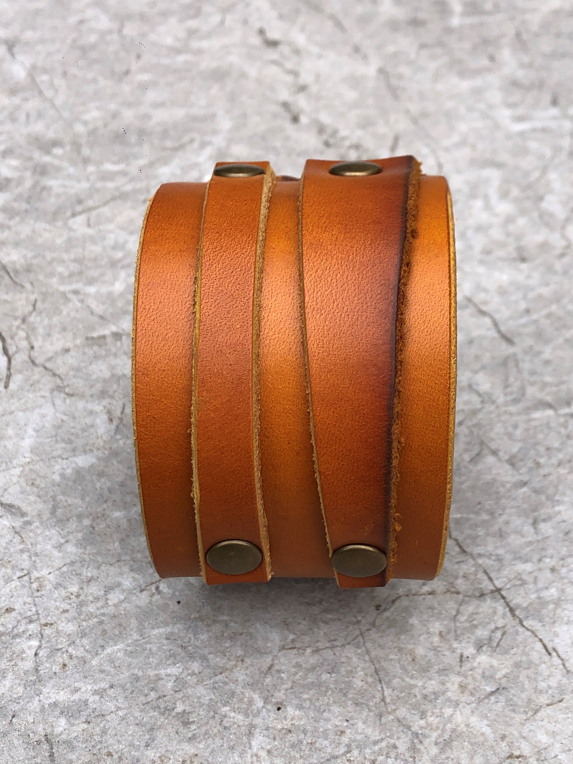 Achilles - Distressed Leather Cuff / Bracelet in Golden Tan. Handmade with premium full grain vegetable tanned Italian leather, solid brass rivets and snap fasteners (antique brass finish). The Edges are hand burnished with bees wax for a smooth finish. This piece features top layer straps with the edges left intentionally unfinished for an edgy / distressed look.