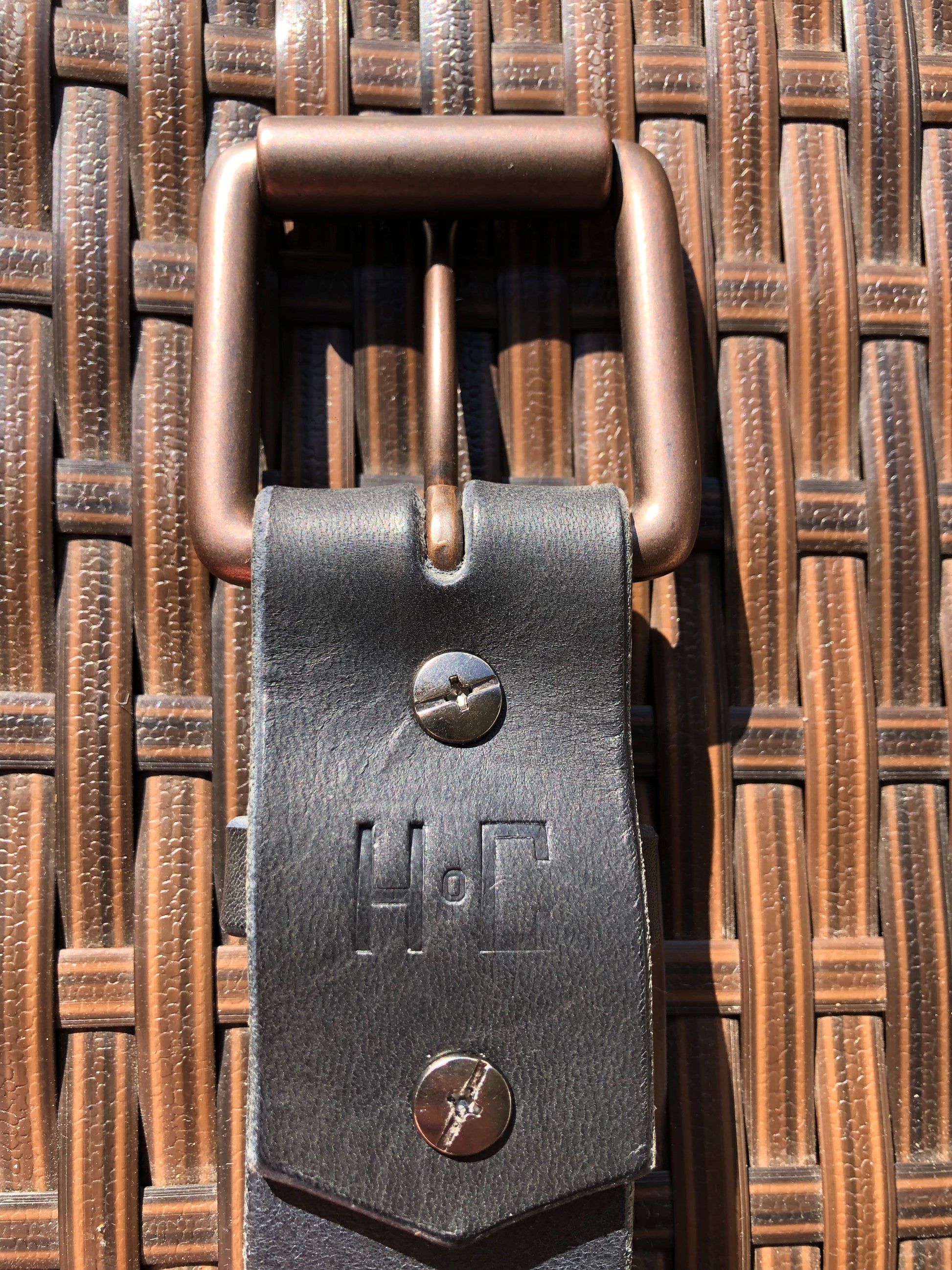 Full grain Italian vegetable tanned leather, zinc alloy buckle with a vintage copper finish, solid brass Chicago screws with a gun metal finish, bees wax.