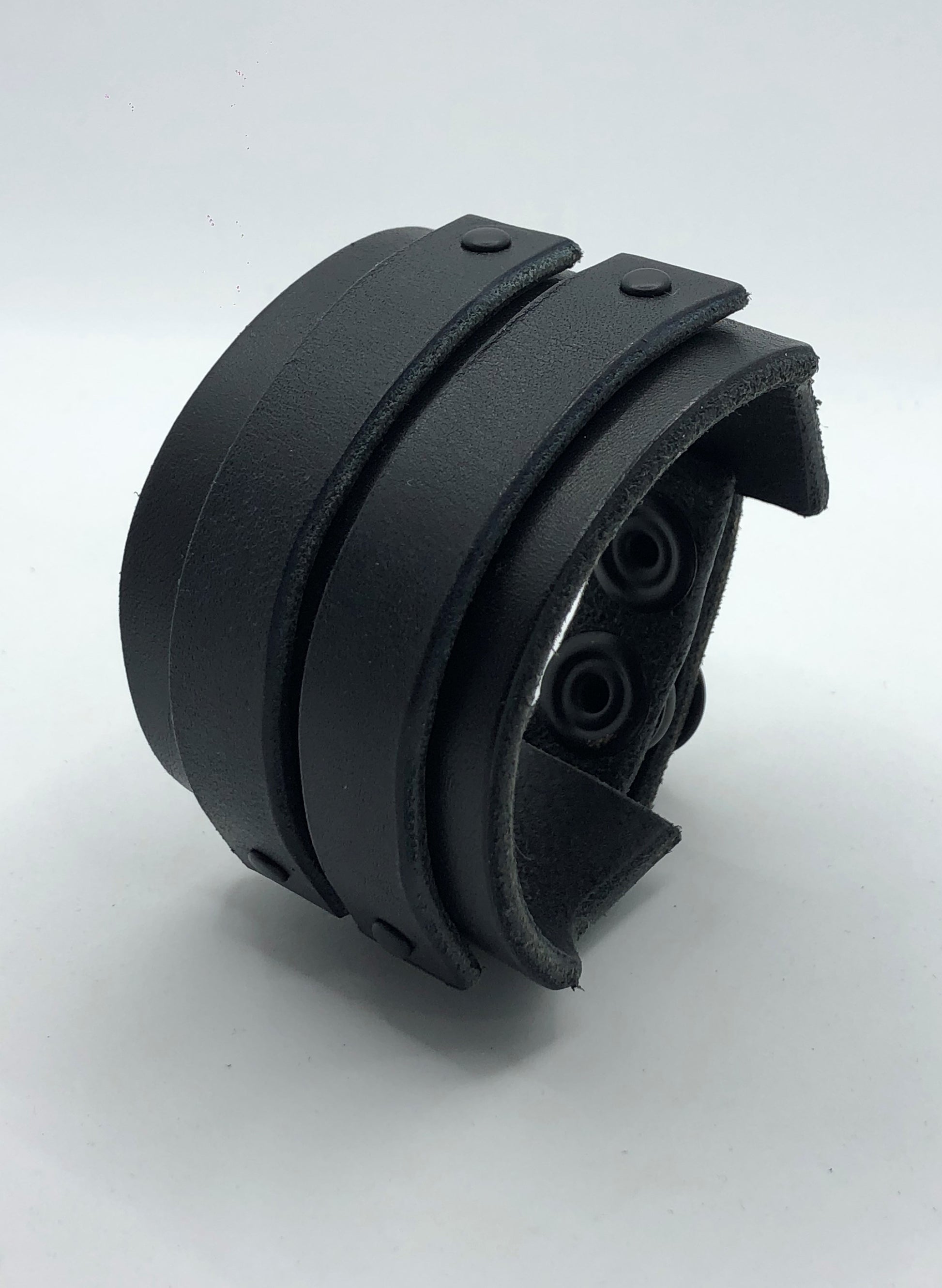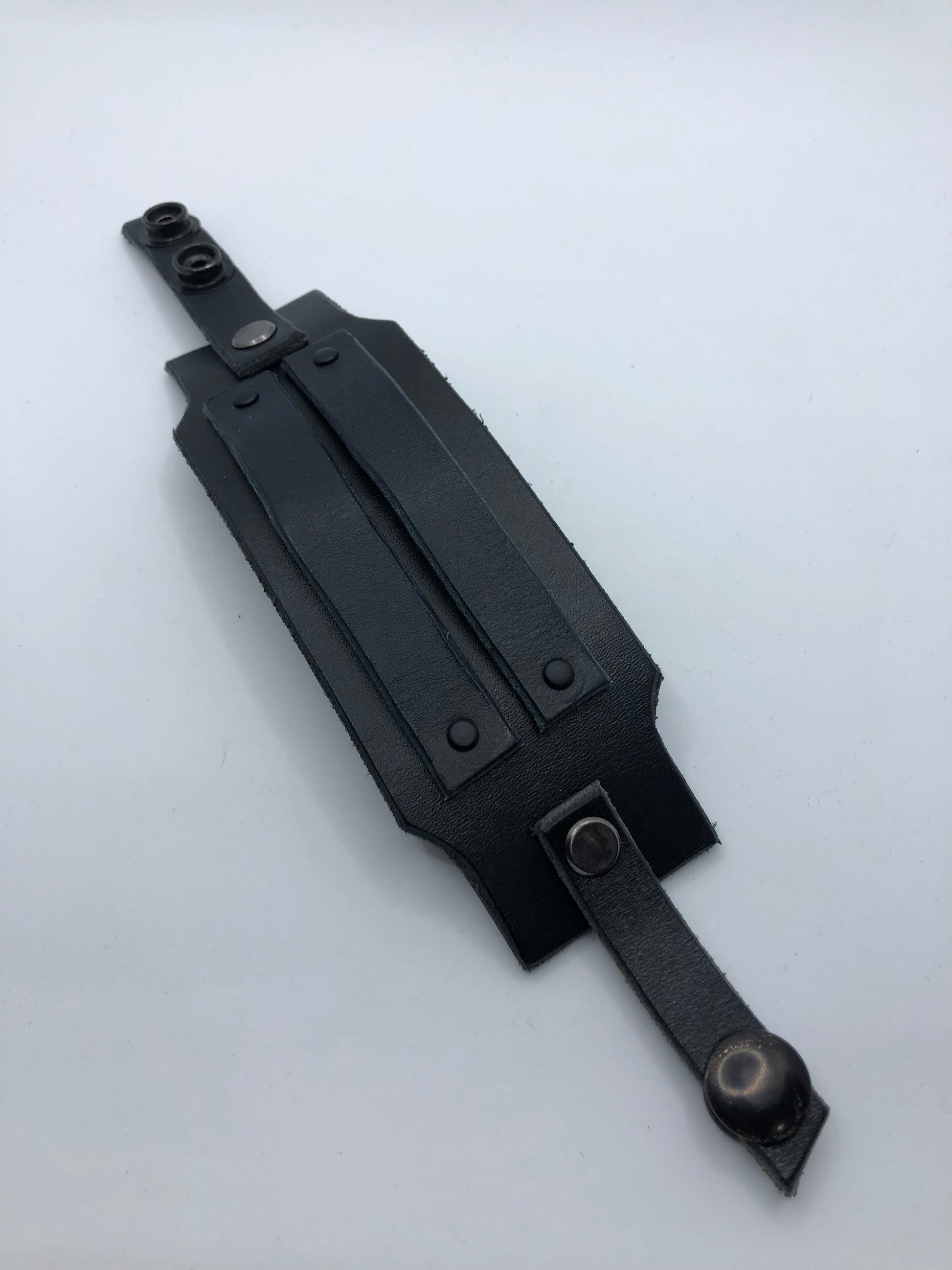 Cypher - Cyberpunk style blue on black Two Tone Wristband / Bracelet. Handcrafted using premium full grain vegetable tanned Italian leather, solid brass chicago screws (gun metal finish), rivets and snap fasteners (matt black finish). Edges hand burnished with bees wax for a smooth finish.