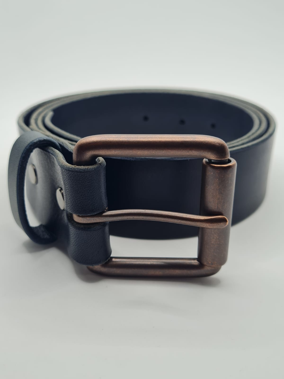 Como - Dark Blue Leather Belt with Vintage Copper Buckle. The combination of the premium soft blue leather and solid vintage copper buckle give this belt a luxurious and rugged look and feel. Handcrafted using full grain premium thick vegetable tanned Italian leather and zinc alloy buckle with a vintage copper finish. Belt edges are hand burnished with bees wax for a smooth finish. Buckles are secured with solid brass removable Chicago screws (gun metal finish). Photos show an angled cut tail style.