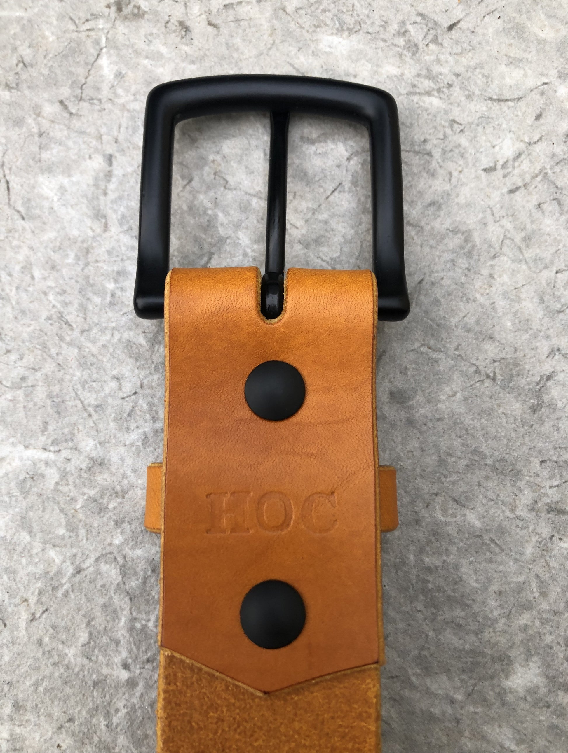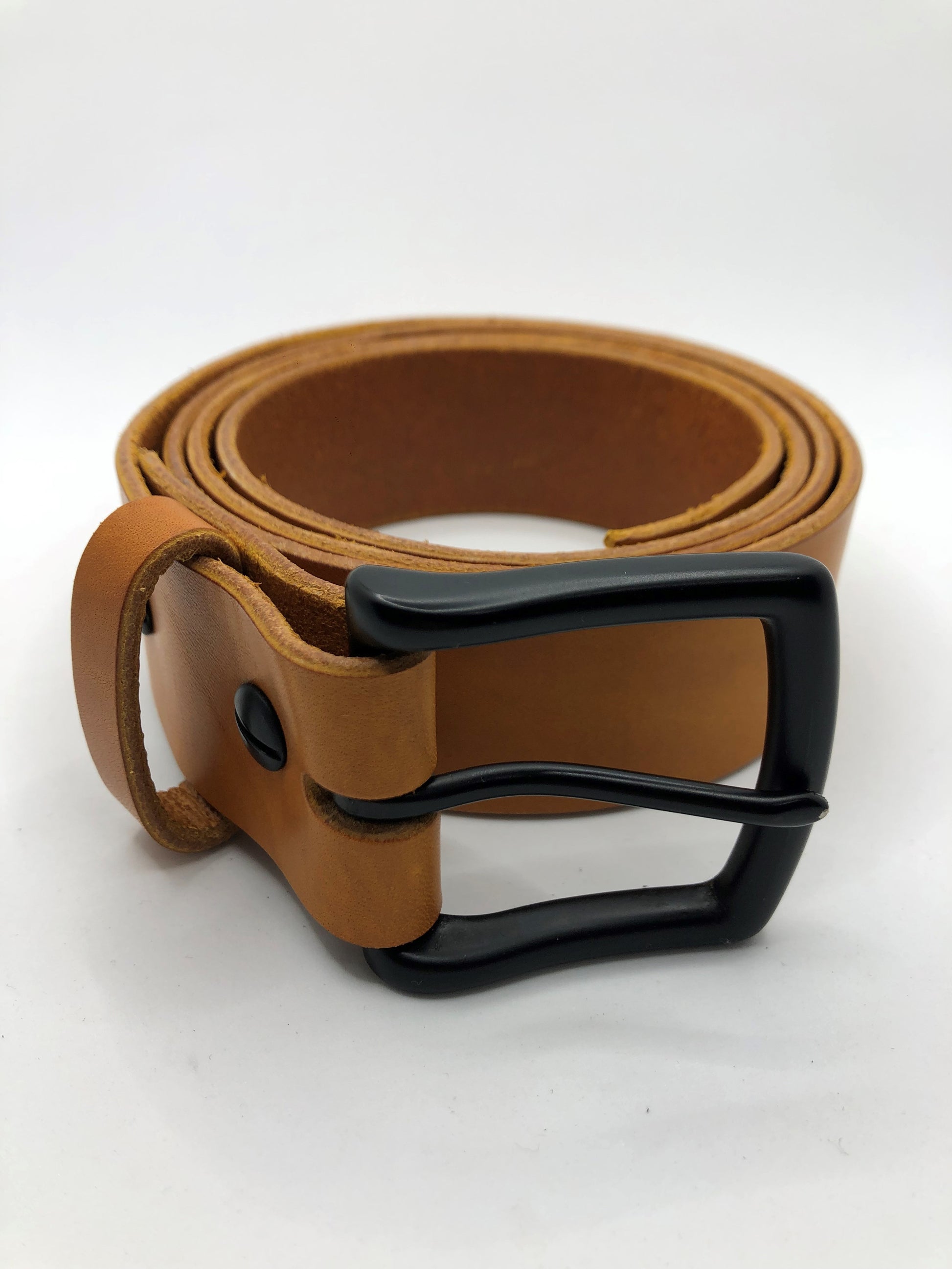 Sahara - Deluxe Tan Leather Belt with a classic, minimal and rugged style, 38mm (1.5 inches) in width. Handcrafted using full grain premium vegetable tanned Italian leather and matt black buckle. Belt edges are hand burnished with bees wax for a smooth finish. Buckles are secured with solid brass removable Chicago screws with a black matt finish.