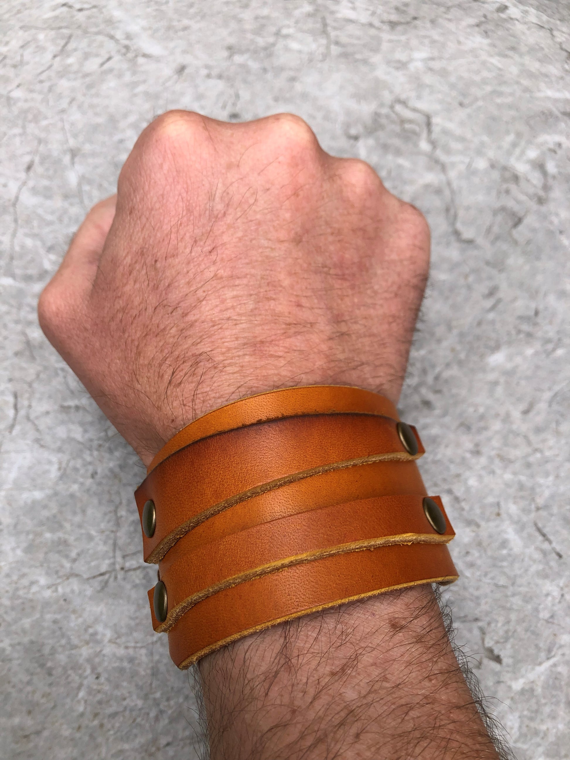 Achilles - Distressed Leather Cuff / Bracelet in Golden Tan. Handmade with premium full grain vegetable tanned Italian leather, solid brass rivets and snap fasteners (antique brass finish). The Edges are hand burnished with bees wax for a smooth finish. This piece features top layer straps with the edges left intentionally unfinished for an edgy / distressed look.