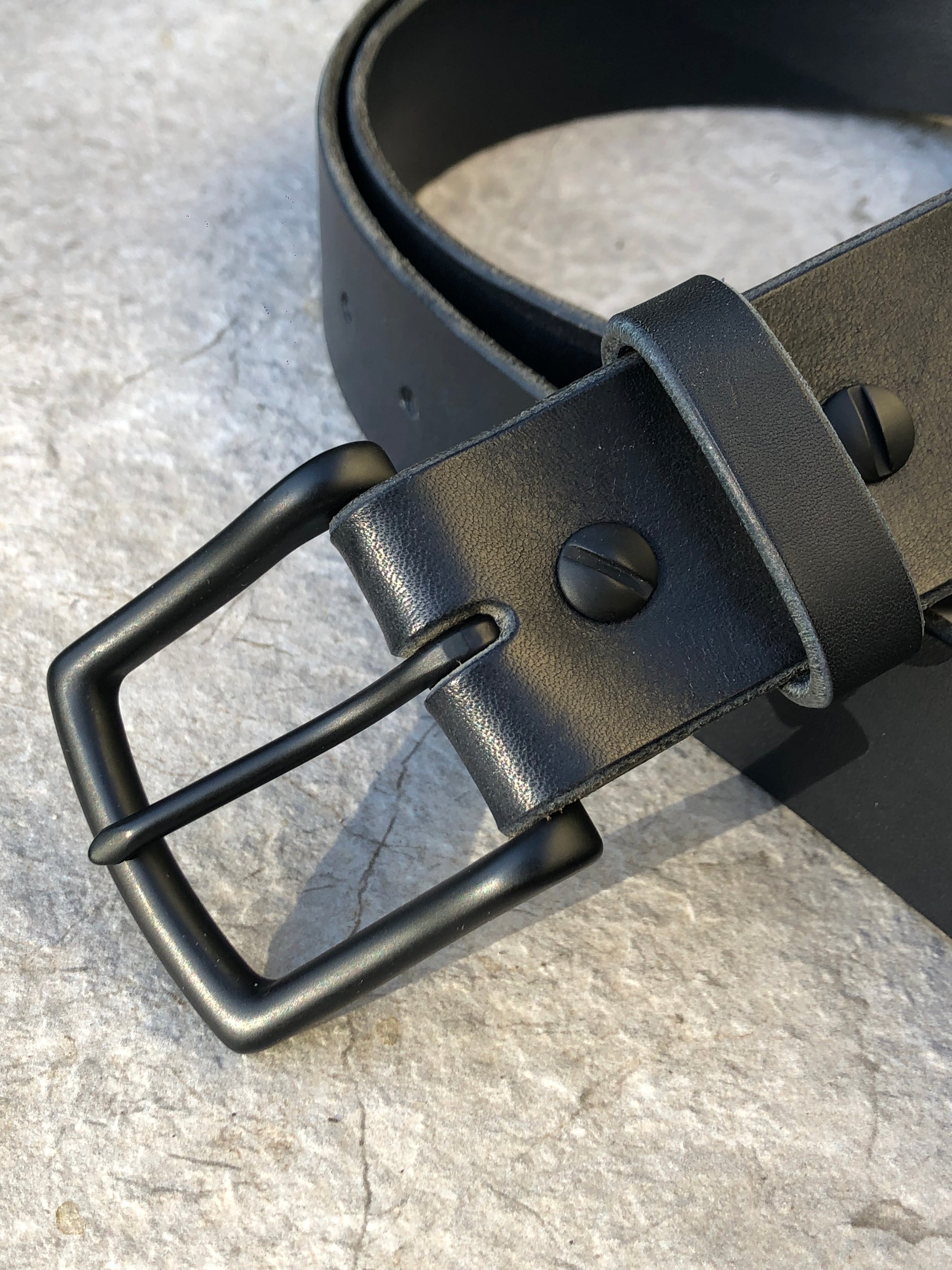 Orion - Dark Blue Leather Belt with a classic, minimal and sleek style. Handcrafted using full grain premium soft Italian leather and matt black heel bar buckle. Belt edges are hand burnished with bees wax for a smooth finish. Buckles are secured with matt black removable Chicago screws. Photos show an angled cut tail style.