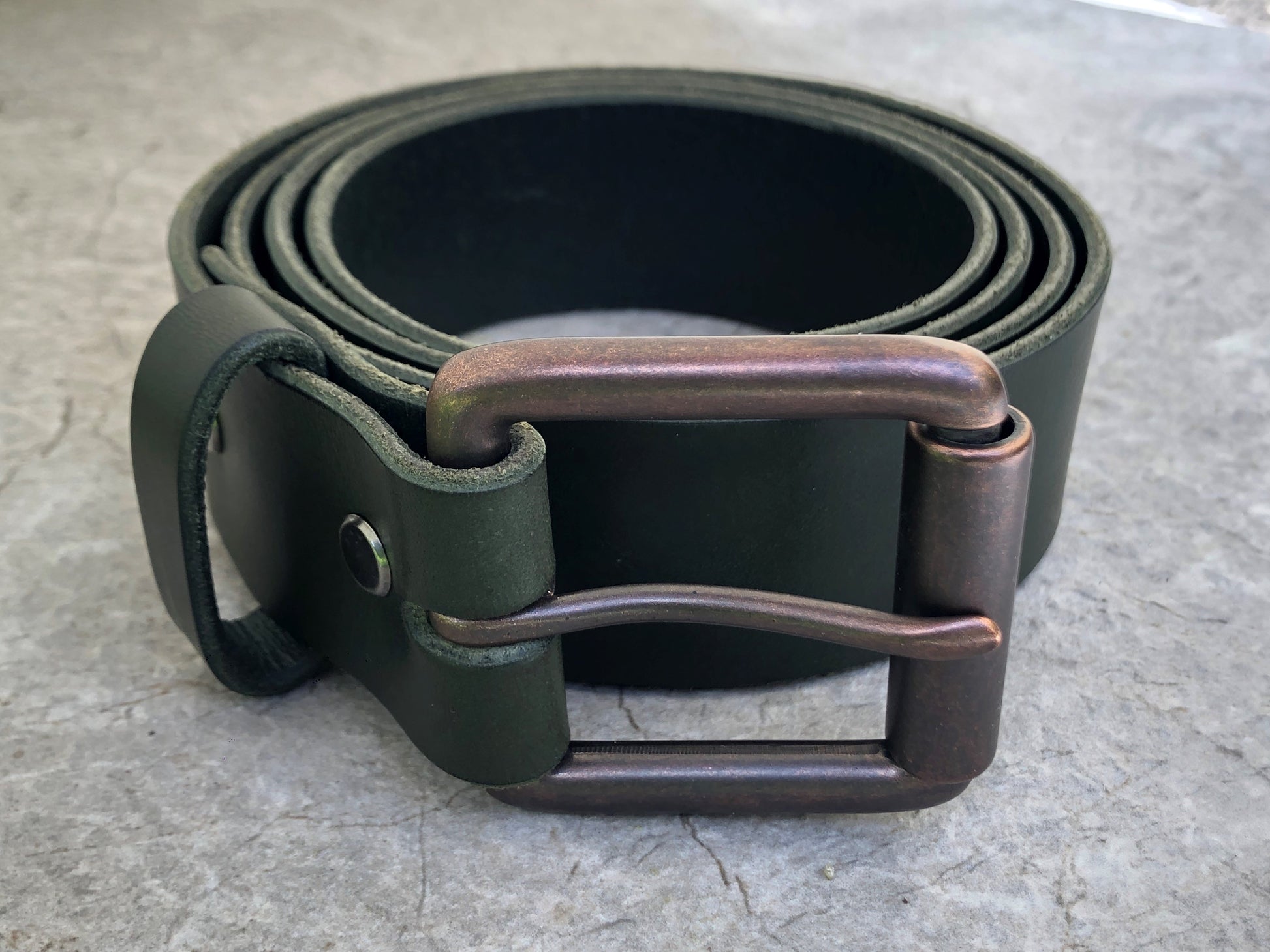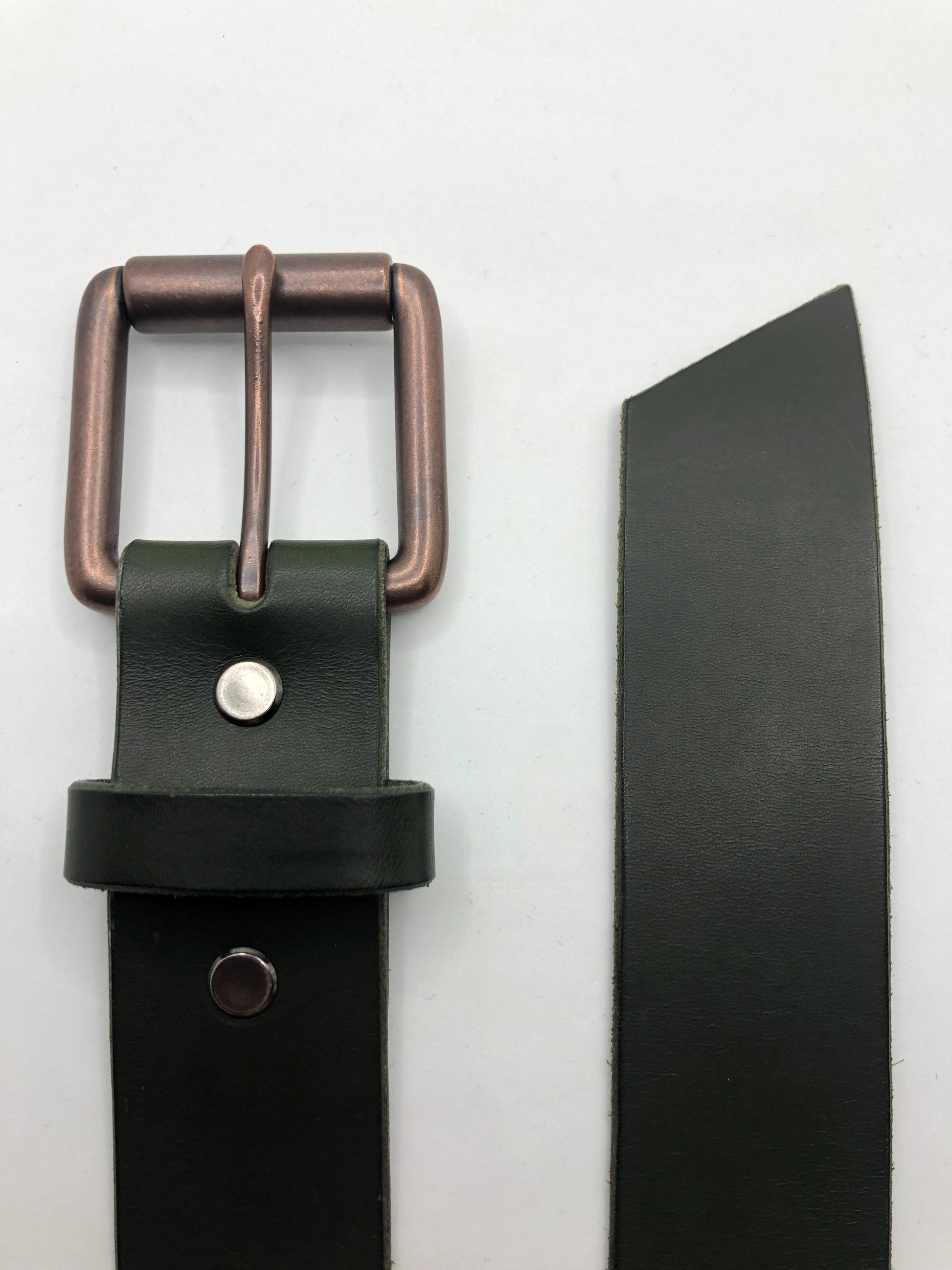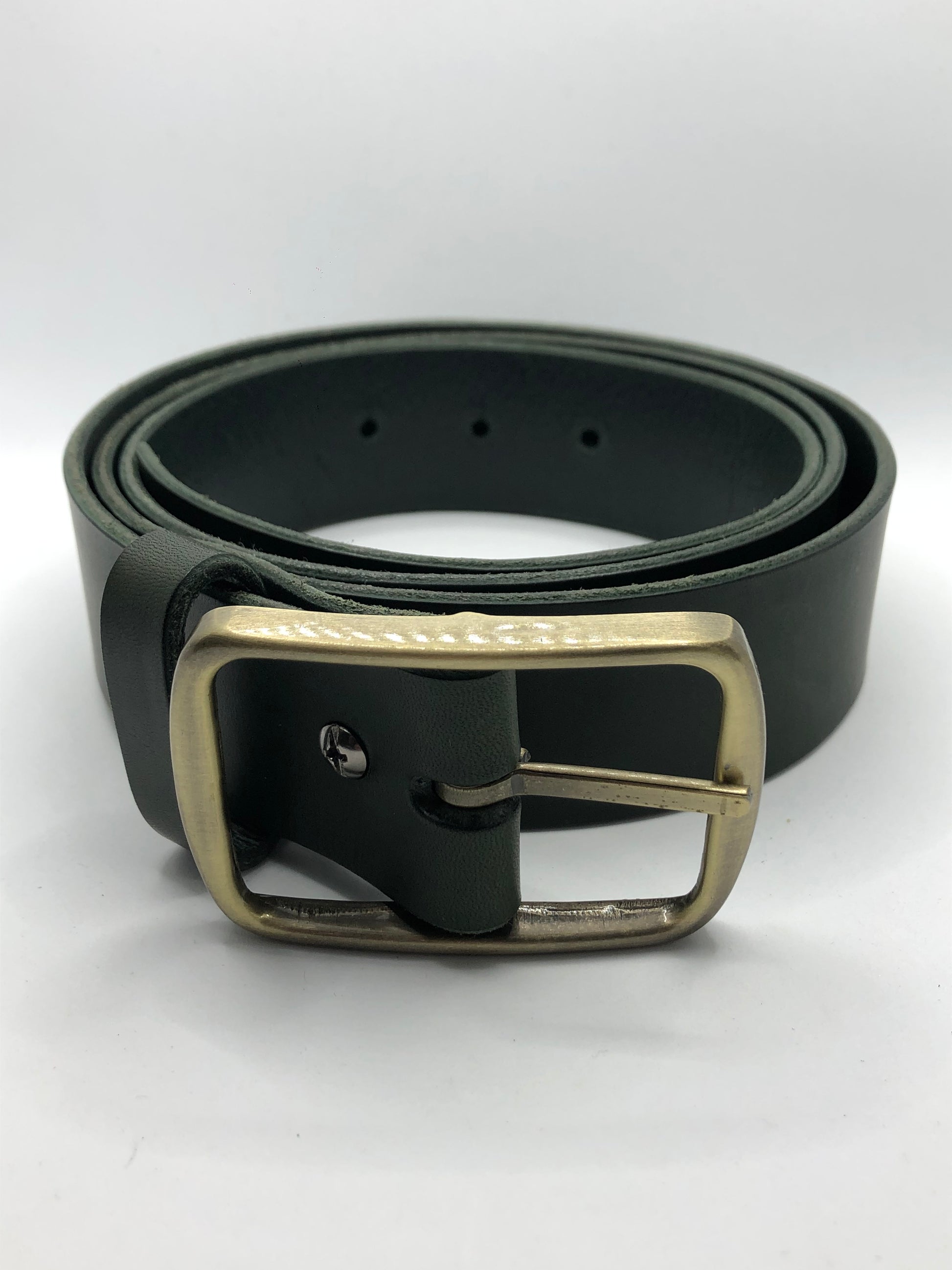 Pirate Belt - 38mm (1.5 inches) wide Dark olive green belt with a classic, minimal and rugged style. Handcrafted using full grain premium vegetable tanned Italian leather and a choice of either an antique brass buckle or vintage copper-finished buckle (see first image). Belt edges are hand burnished with bees wax for a smooth finish. Buckles are secured with solid brass removable Chicago screws so you can change buckles.