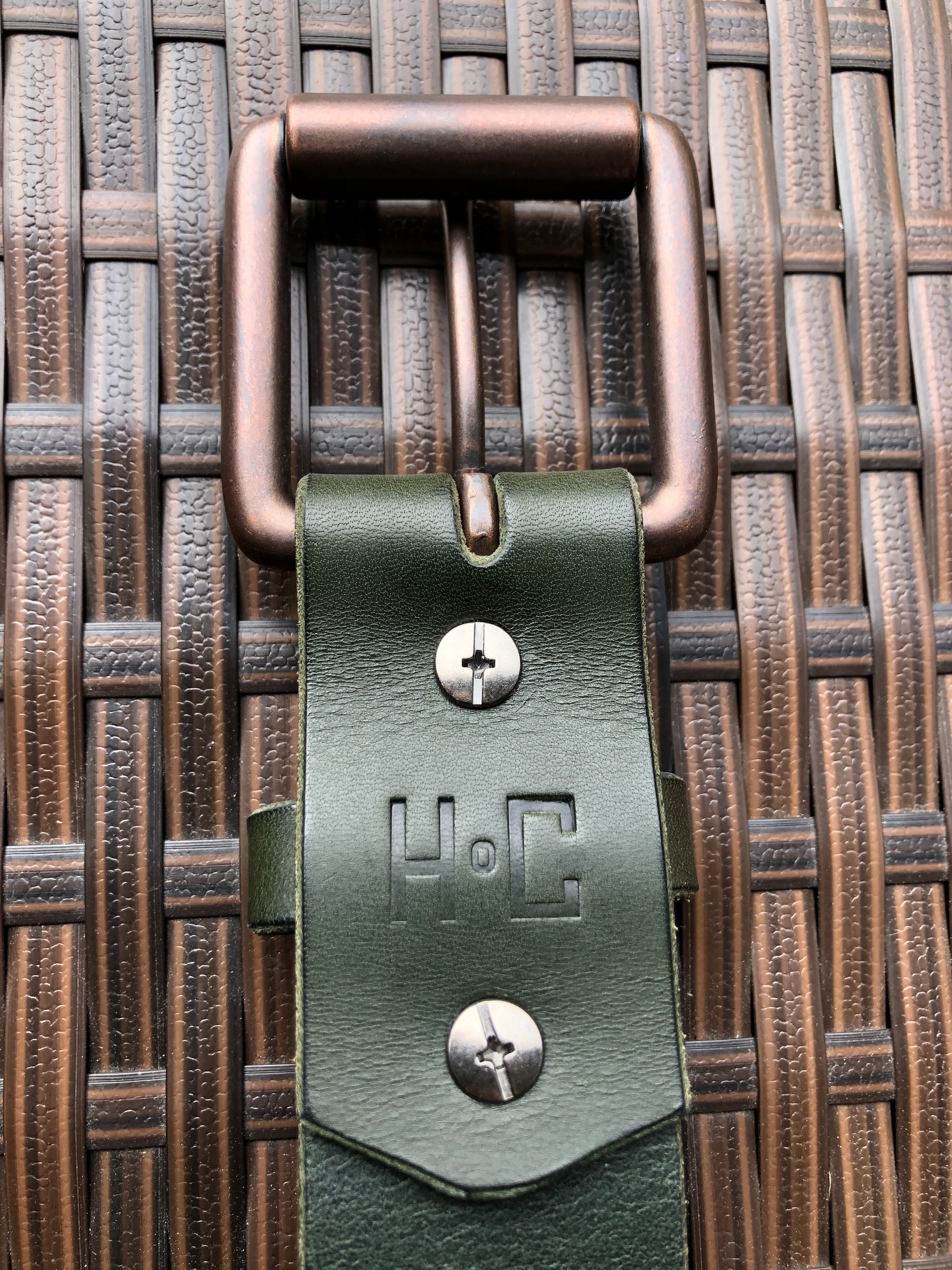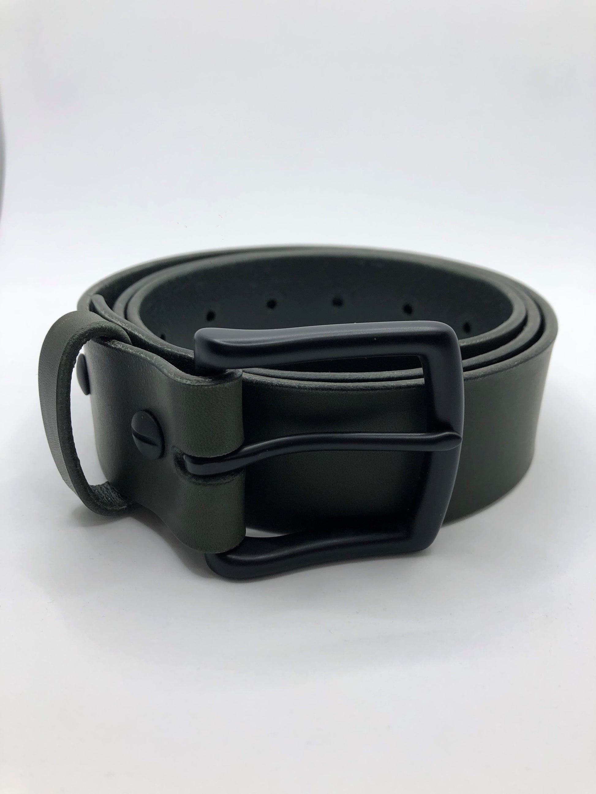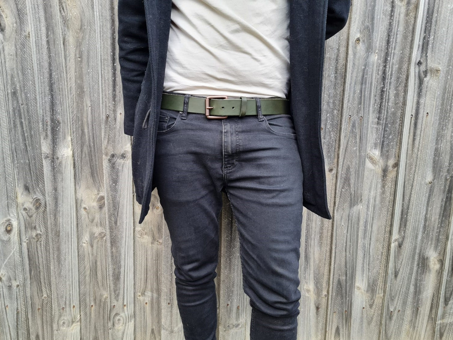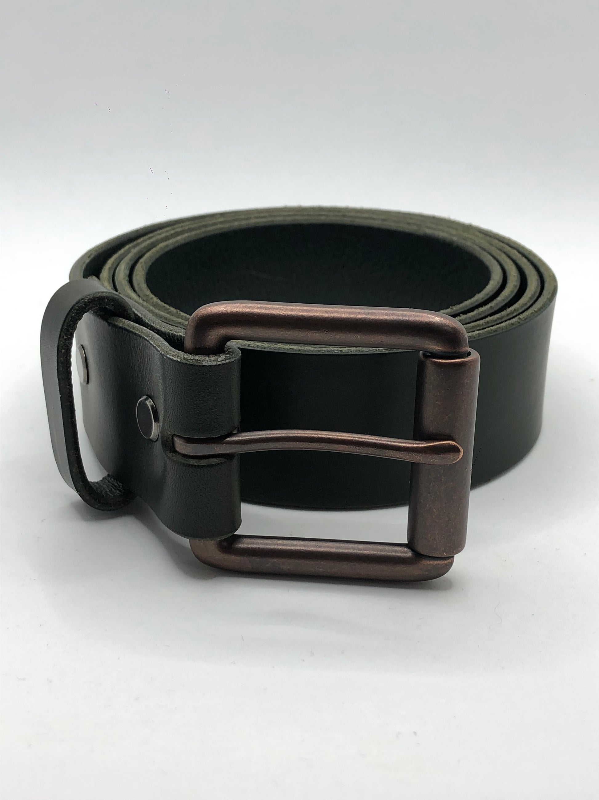 Pirate Belt - 38mm (1.5 inches) wide Dark olive green belt with a classic, minimal and rugged style. Handcrafted using full grain premium vegetable tanned Italian leather and a choice of either an antique brass buckle or vintage copper-finished buckle (see first image). Belt edges are hand burnished with bees wax for a smooth finish. Buckles are secured with solid brass removable Chicago screws so you can change buckles.
