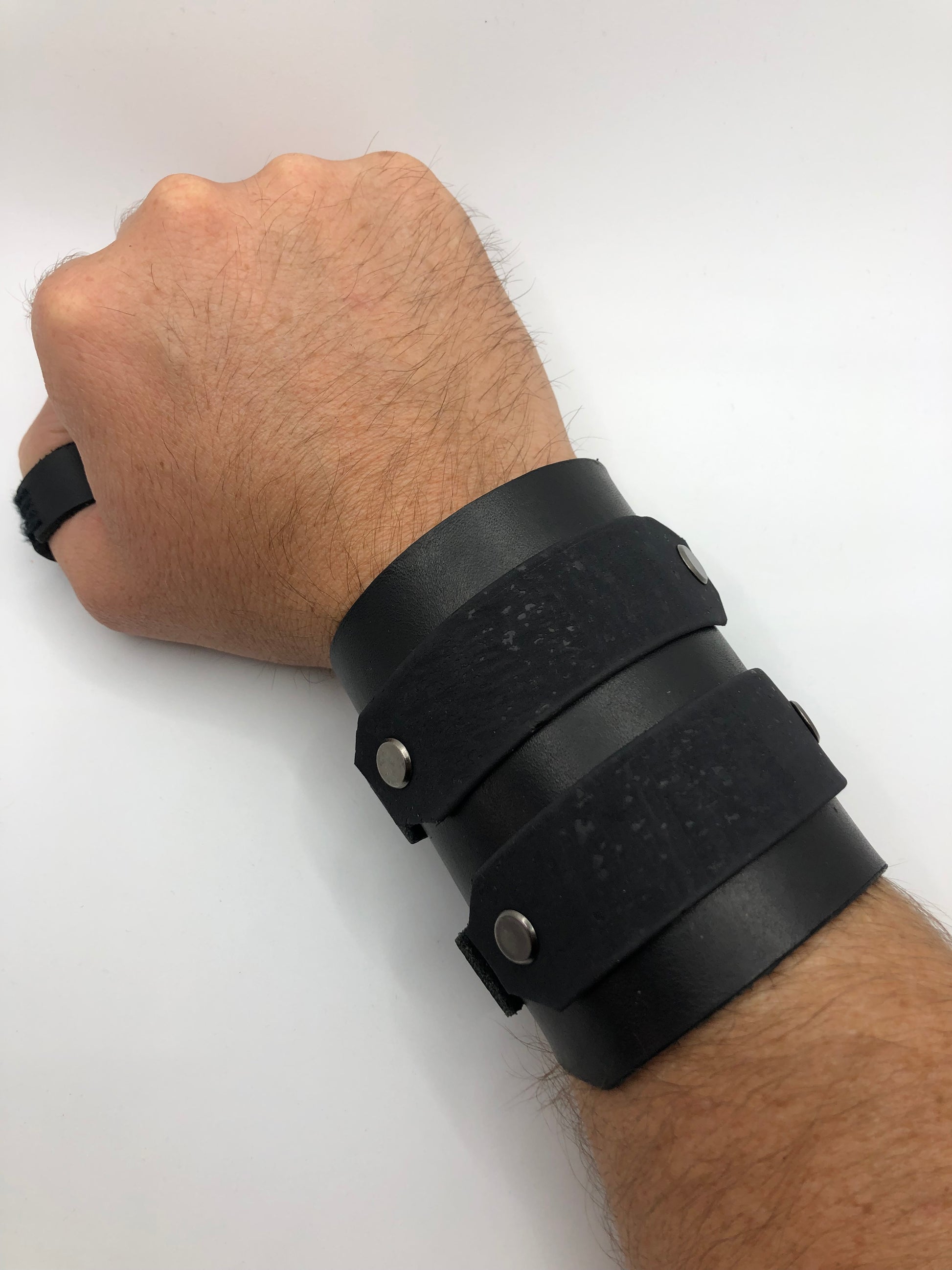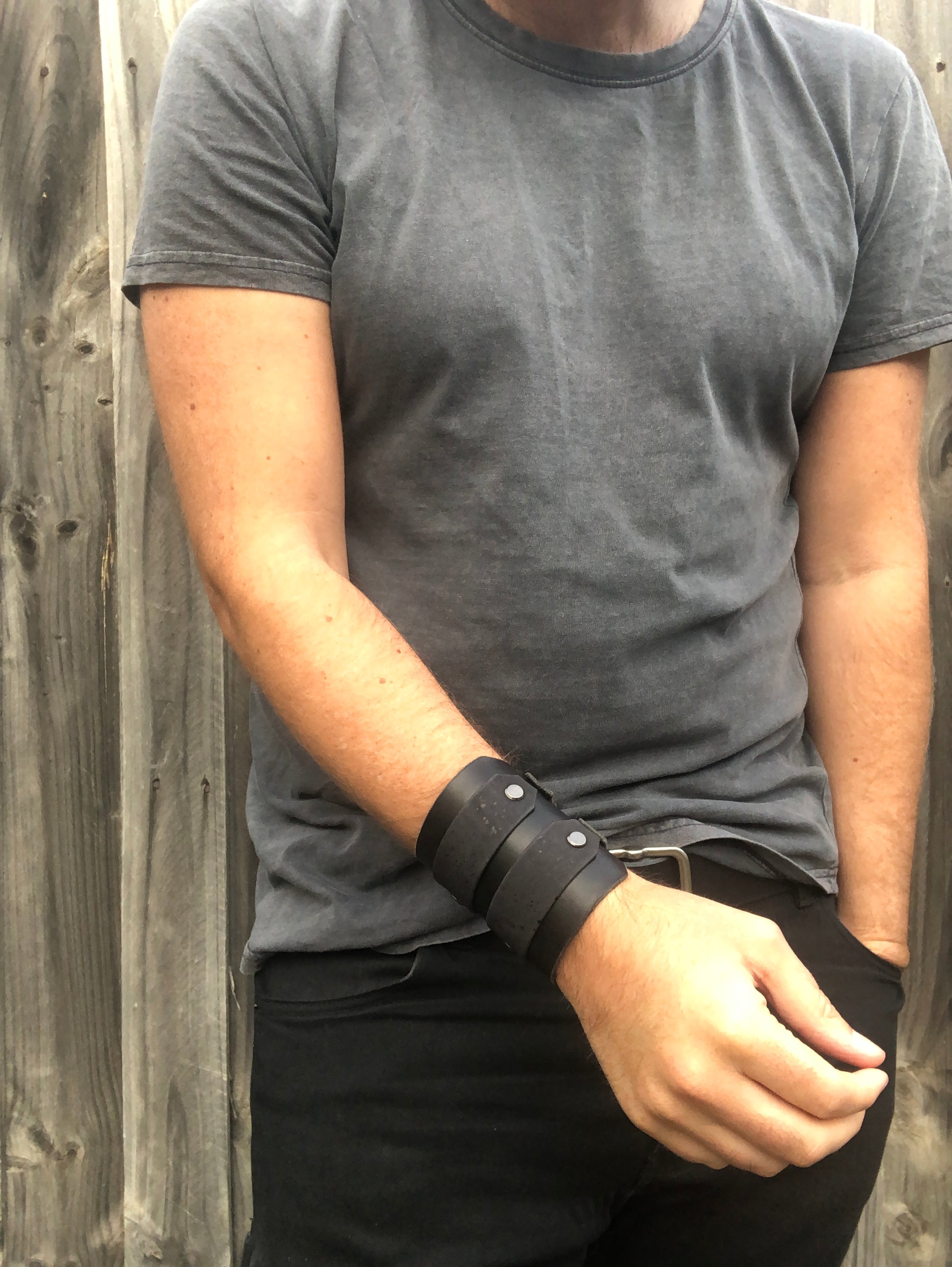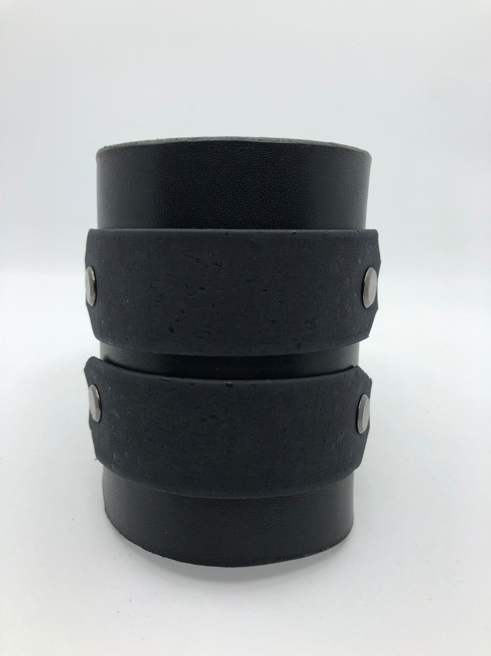 'Rexor' in Black - Warrior style extra wide thick double strap wristband. Inspired by the film Conan the Barbarian, handcrafted using thick full grain vegetable tanned leather, solid brass Chicago screws (gun metal finish) and snap fasteners (antique brass finish). The top layer straps are sourced from sustainable vegan Portuguese cork leather.