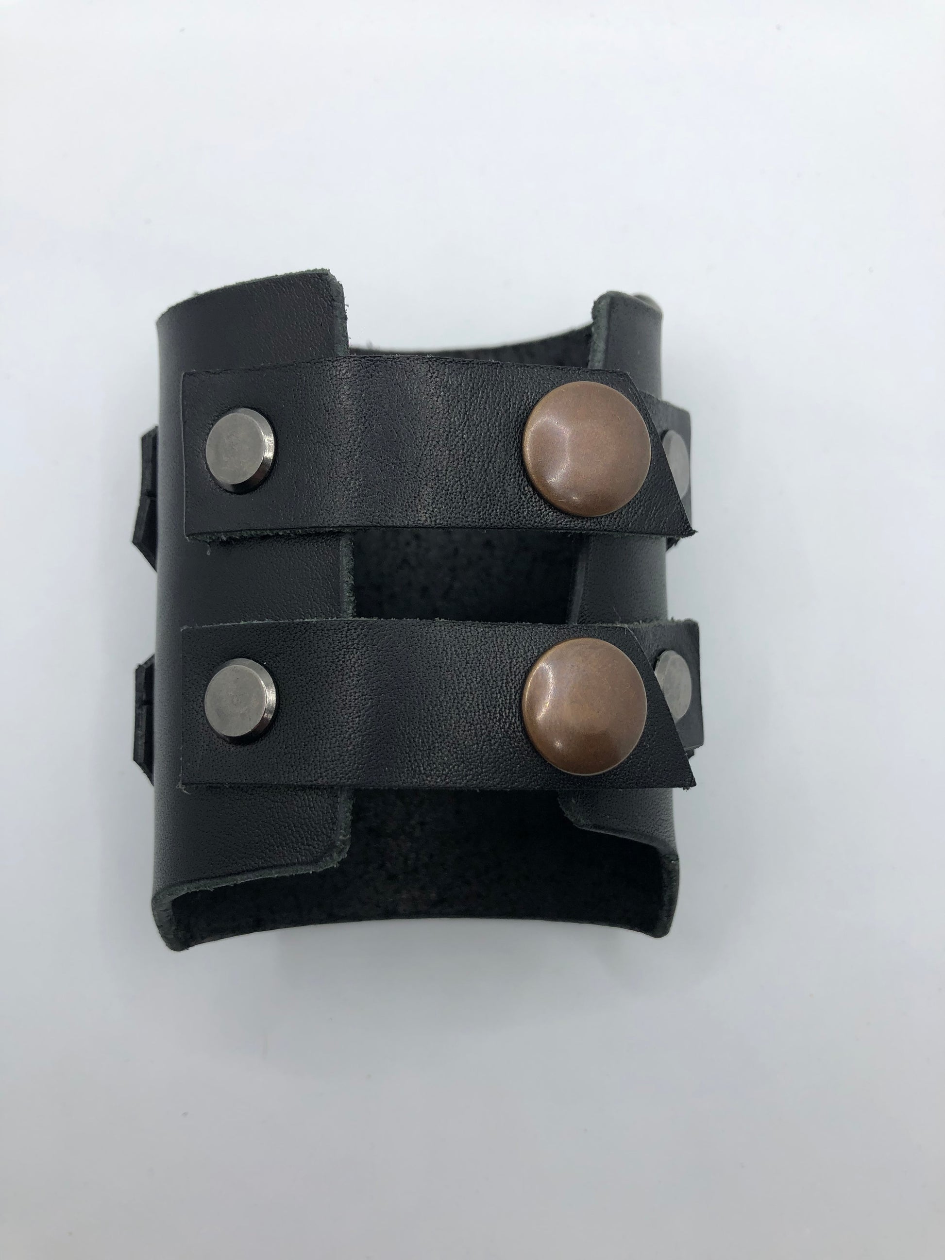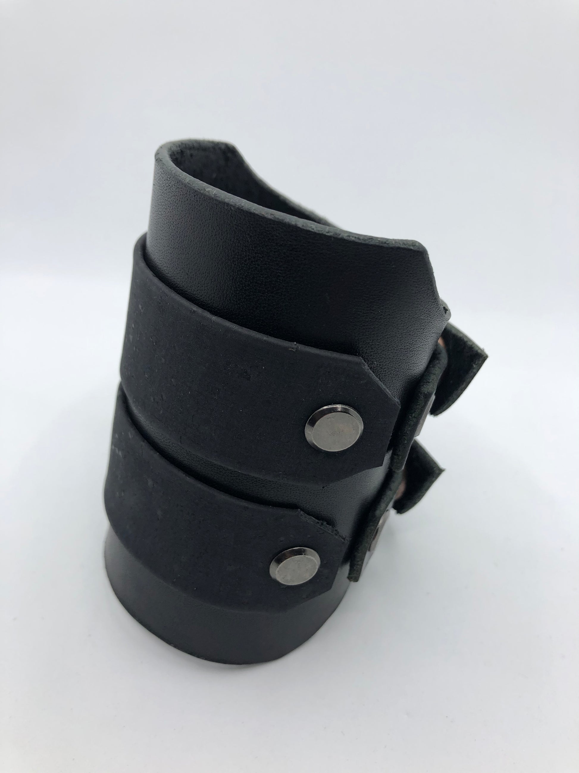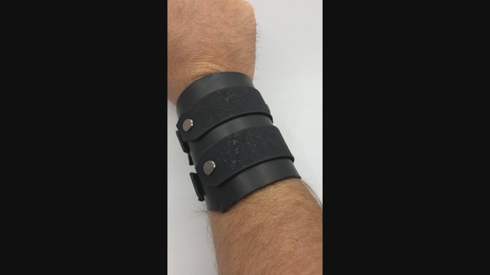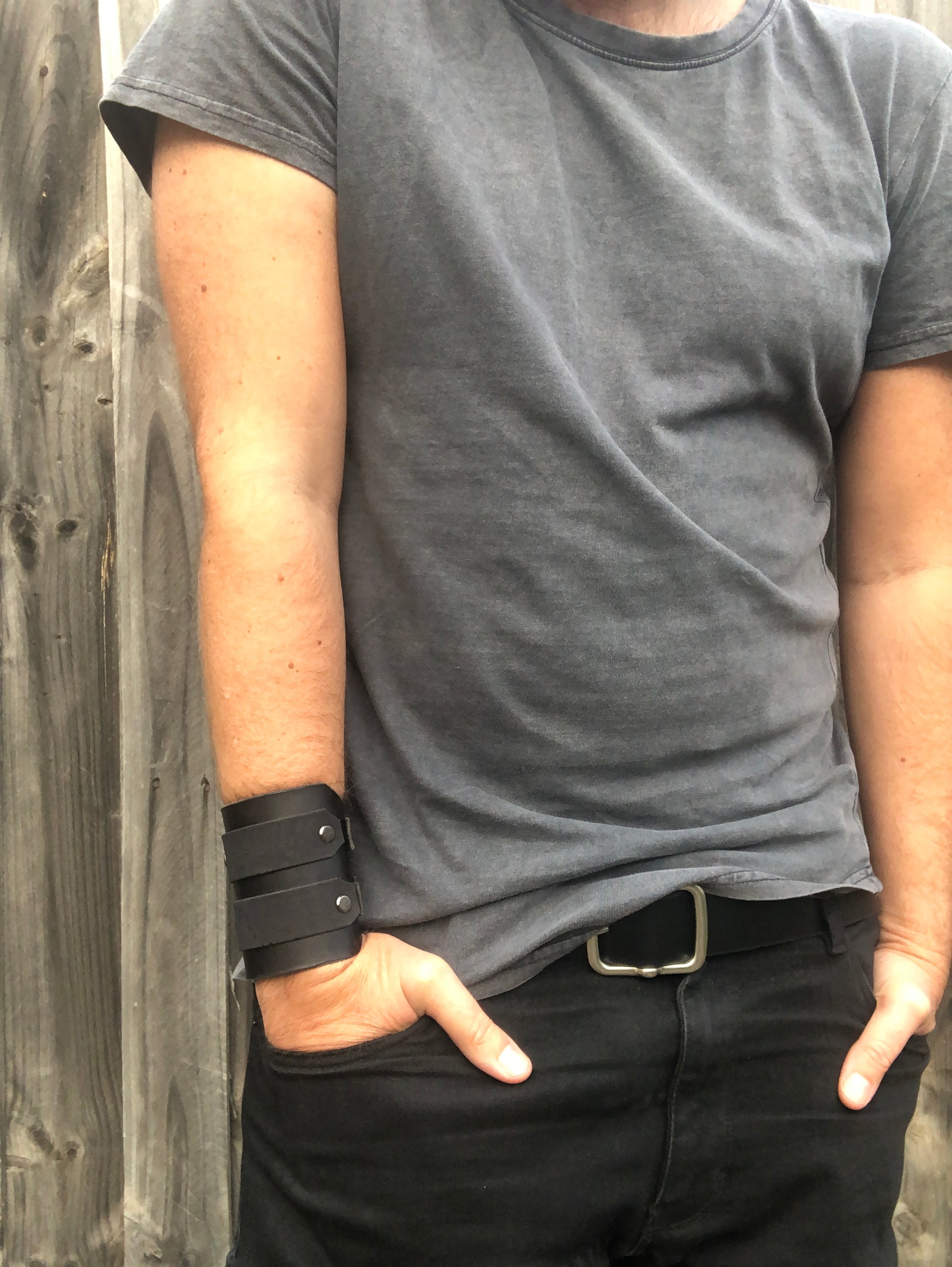 'Rexor' in Black - Warrior style extra wide thick double strap wristband. Inspired by the film Conan the Barbarian, handcrafted using thick full grain vegetable tanned leather, solid brass Chicago screws (gun metal finish) and snap fasteners (antique brass finish). The top layer straps are sourced from sustainable vegan Portuguese cork leather.