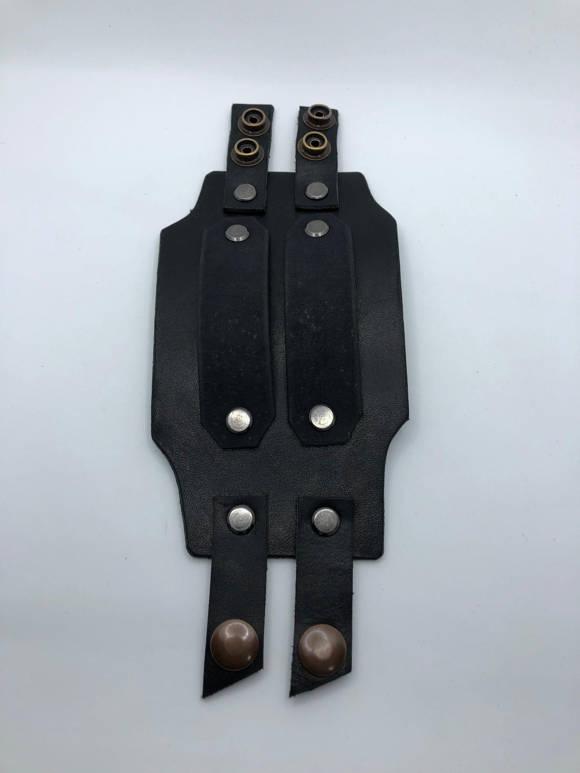 Full Grain vegetable tanned leather base and Portugeuse vegan cork leather top straps. Solid brass Chicago screws and snap fasteners, bees wax.