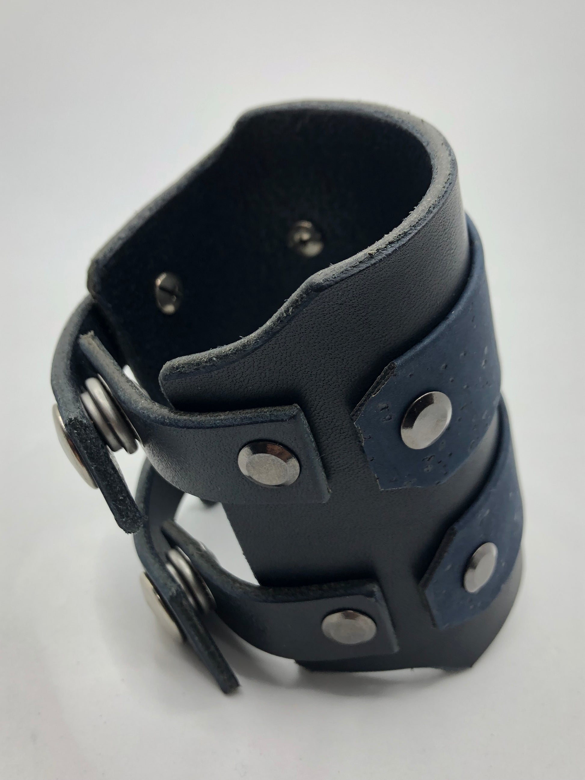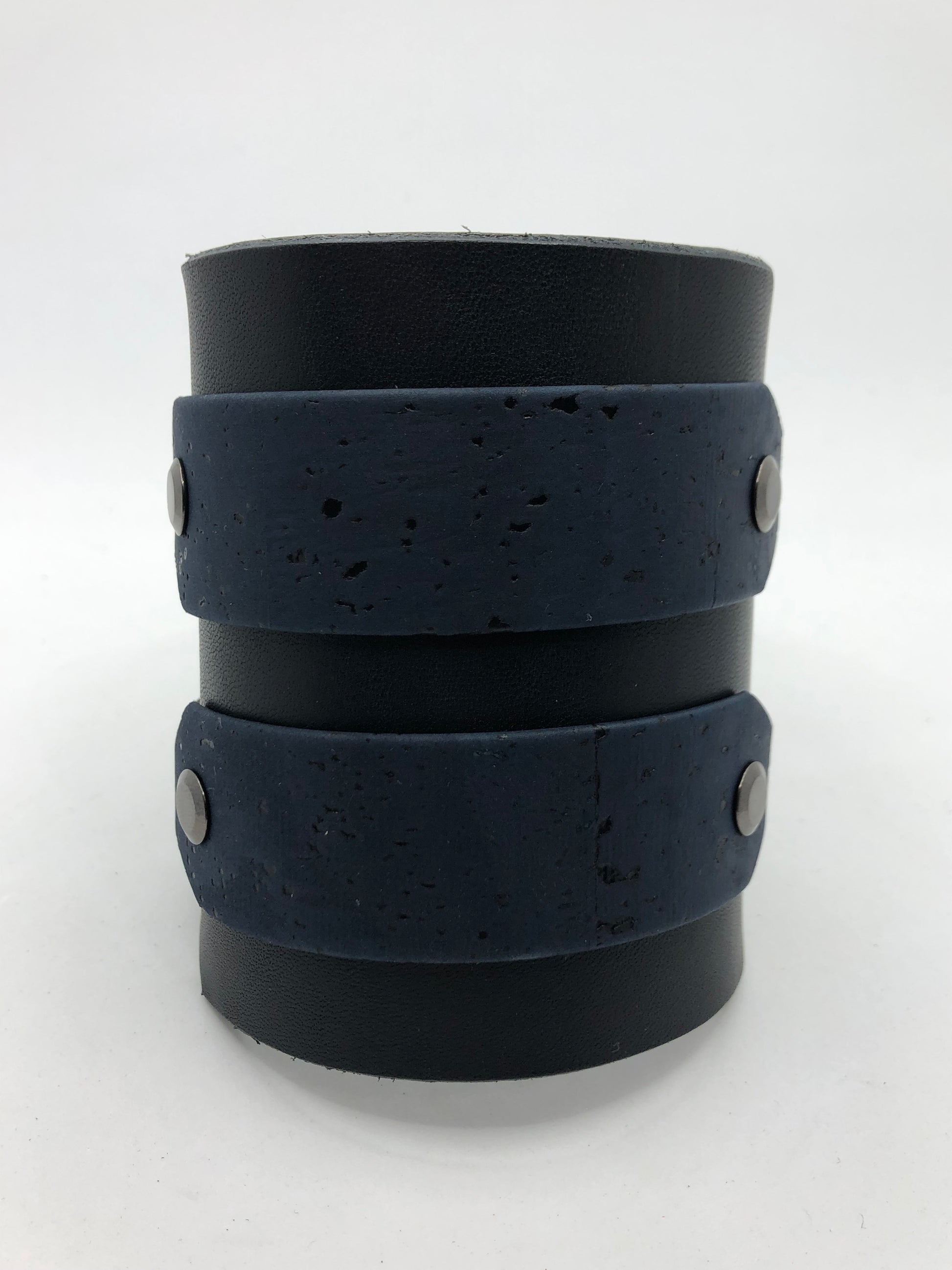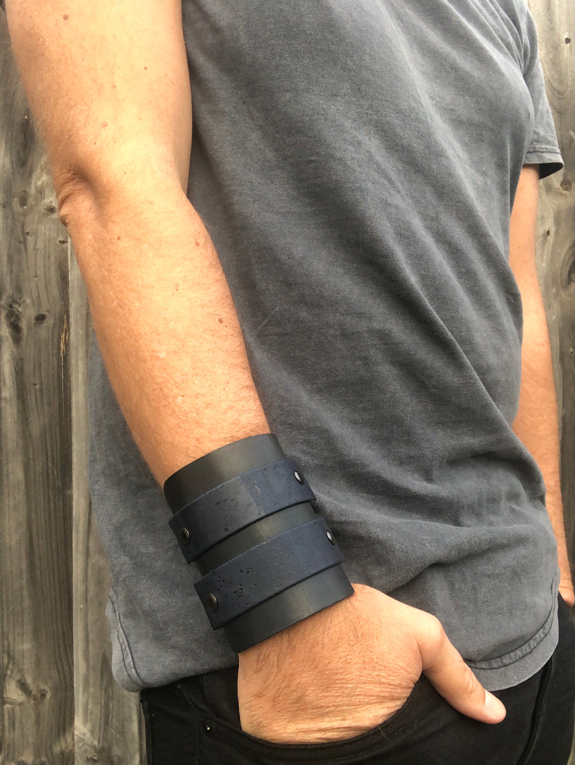 'Rexor' in Navy Blue - Warrior style extra wide thick double strap wristband. Inspired by the film Conan the Barbarian, handcrafted using premium Italian full grain vegetable tanned leather, solid brass Chicago screws (gun metal finish) and snap fasteners (matt nickel finish). The top layer straps are sourced from sustainable vegan Portuguese cork leather.