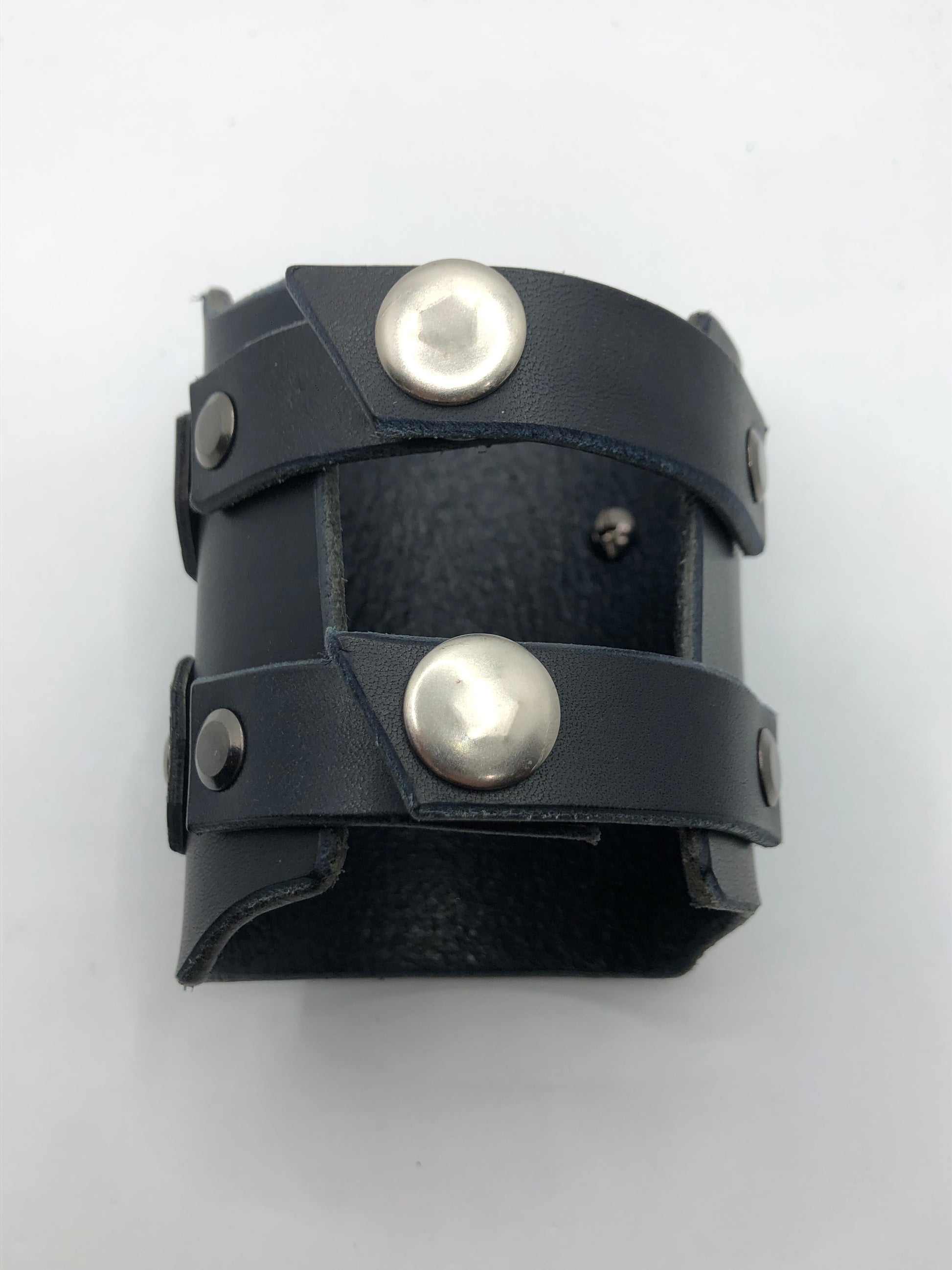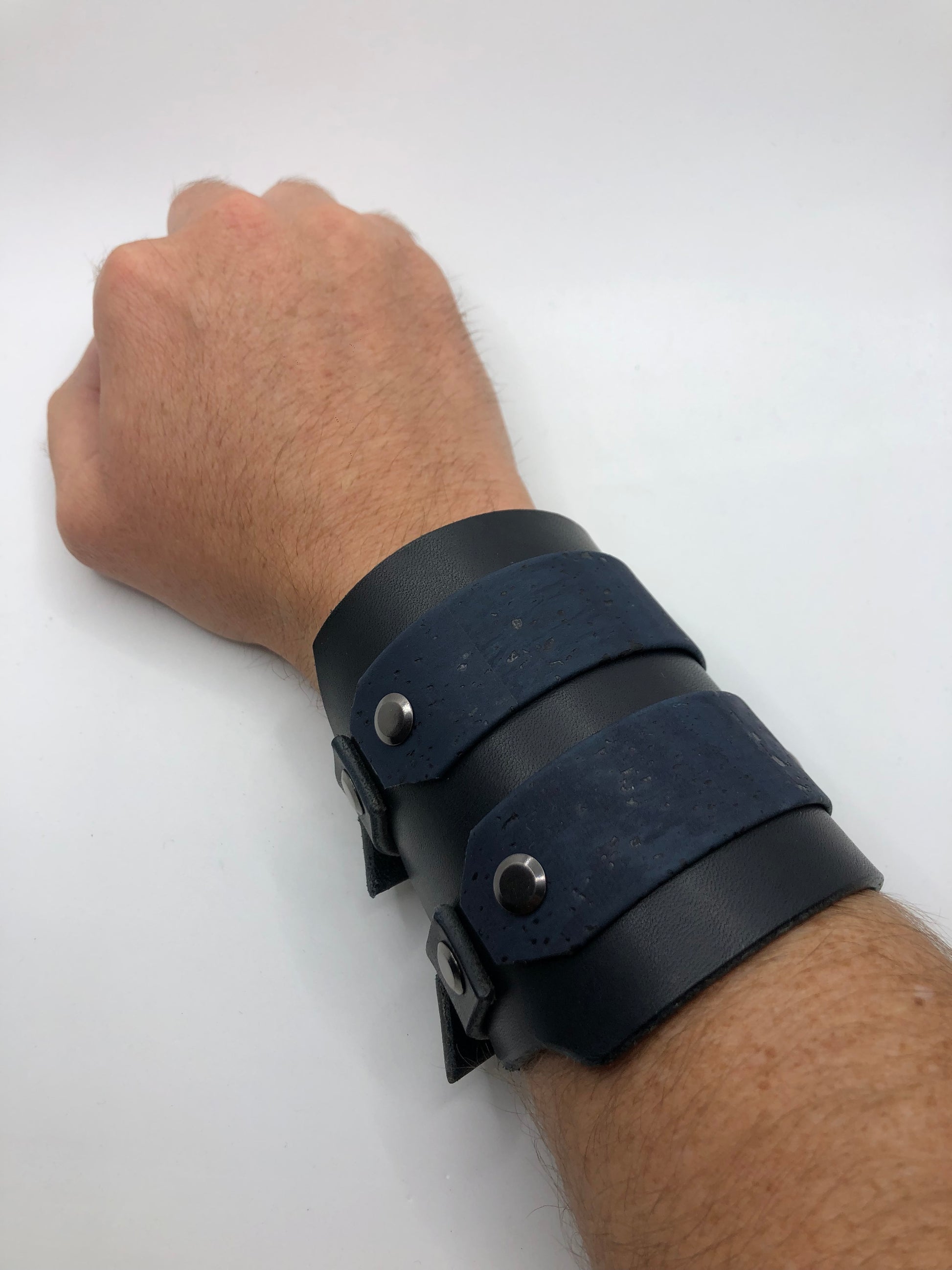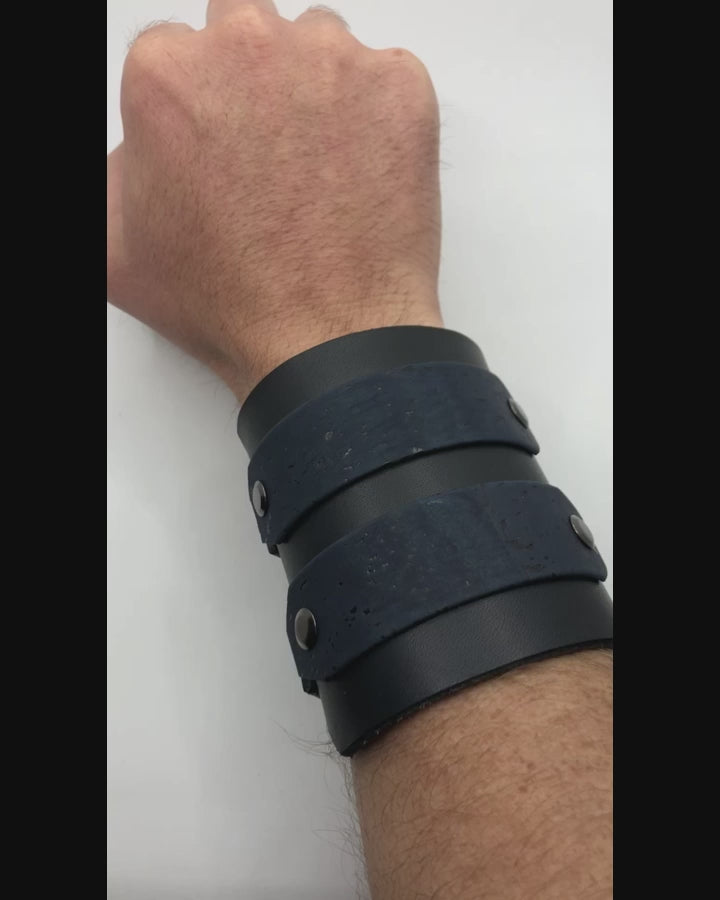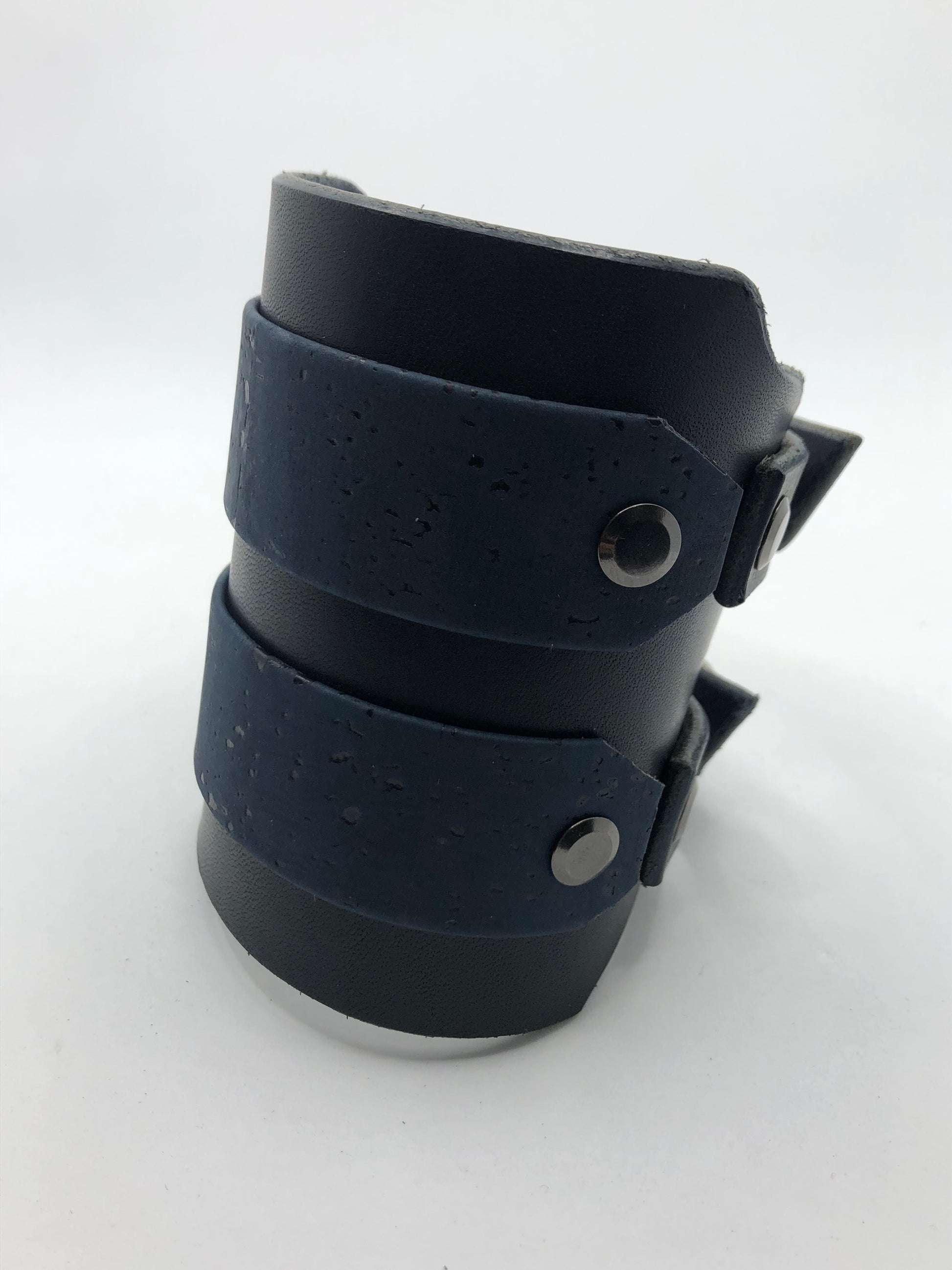 'Rexor' in Navy Blue - Warrior style extra wide thick double strap wristband. Inspired by the film Conan the Barbarian, handcrafted using premium Italian full grain vegetable tanned leather, solid brass Chicago screws (gun metal finish) and snap fasteners (matt nickel finish). The top layer straps are sourced from sustainable vegan Portuguese cork leather.