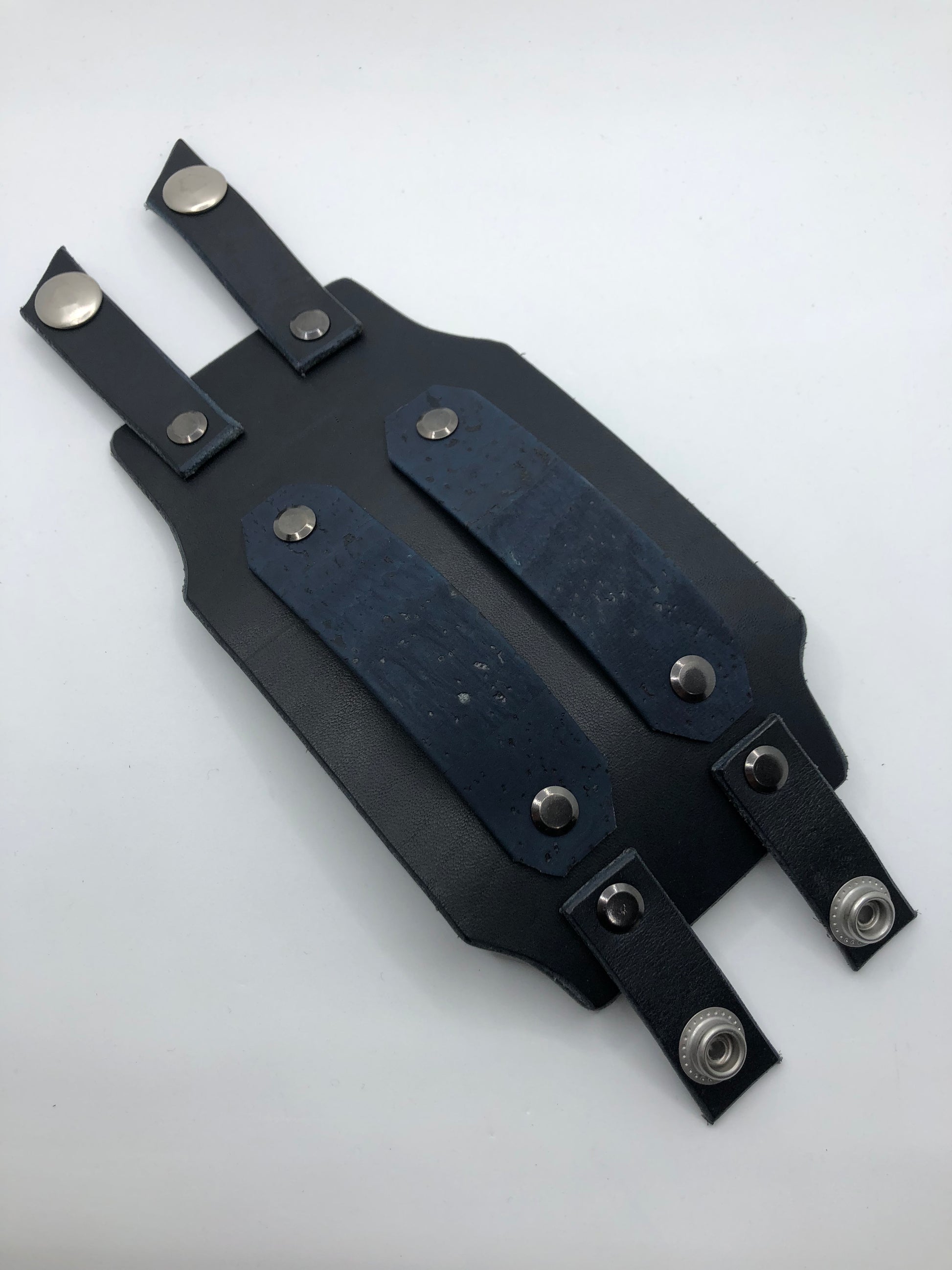 Full grain vegetable tanned Italian leather base and Portugeuse Vegan Cork Leather top layer strapping, solid brass Chicago screws, solid brass snap fasteners, bees wax.