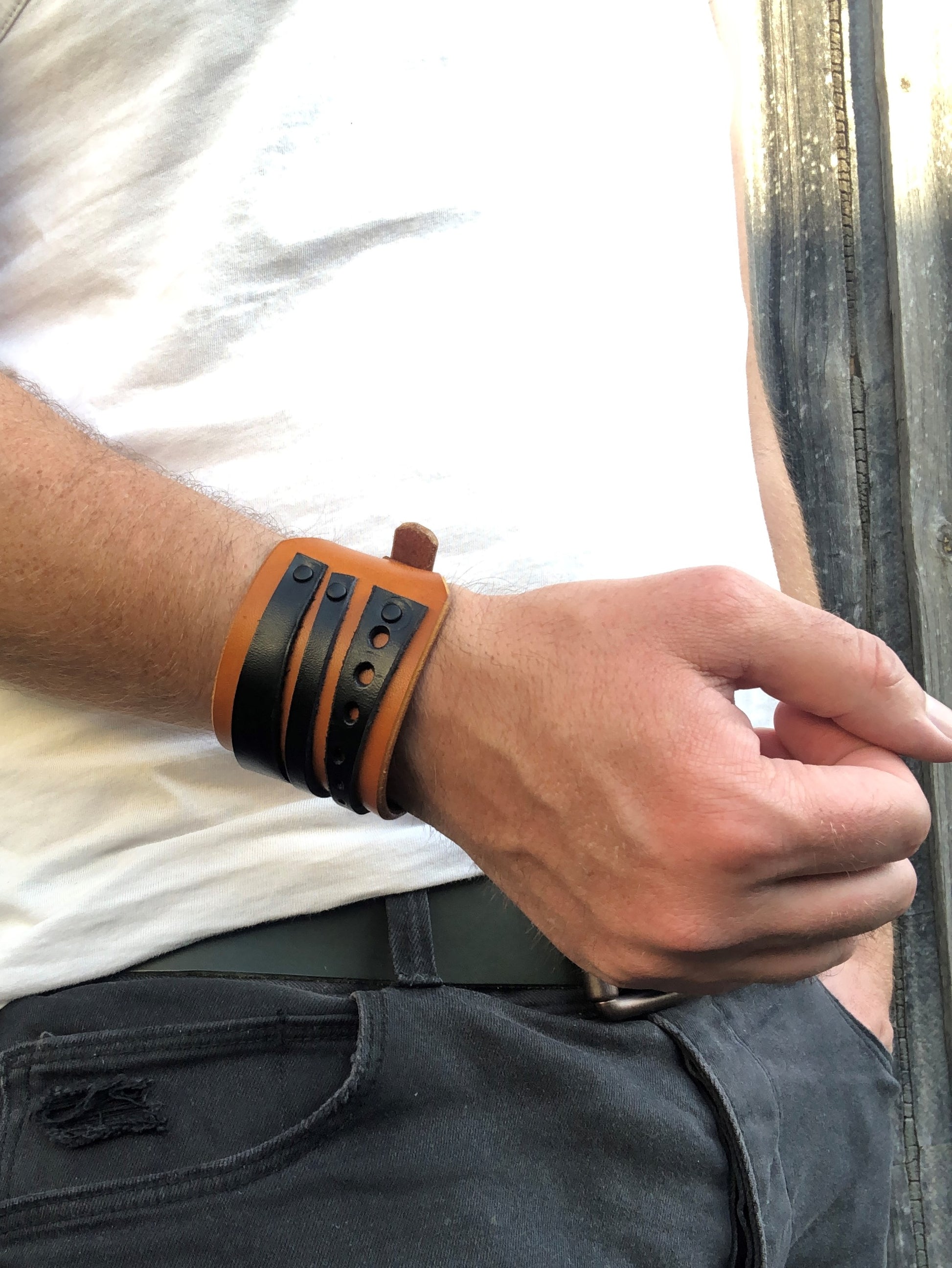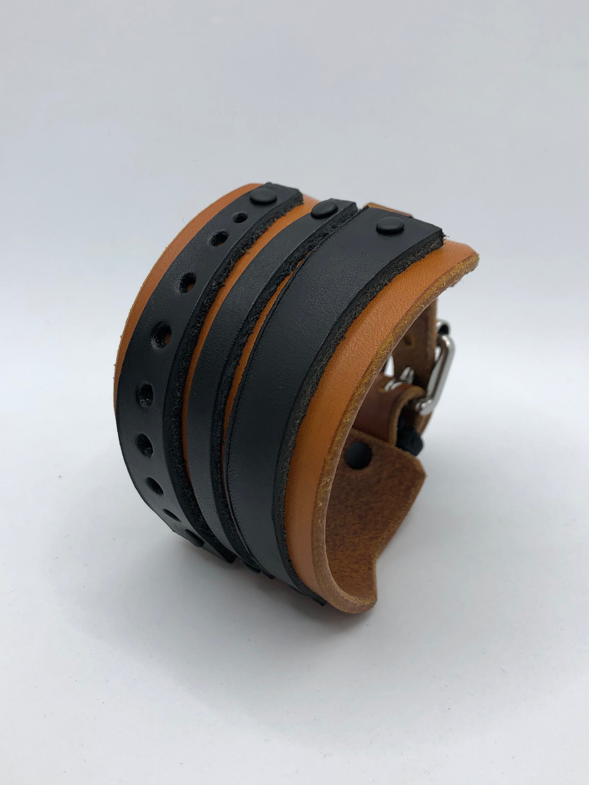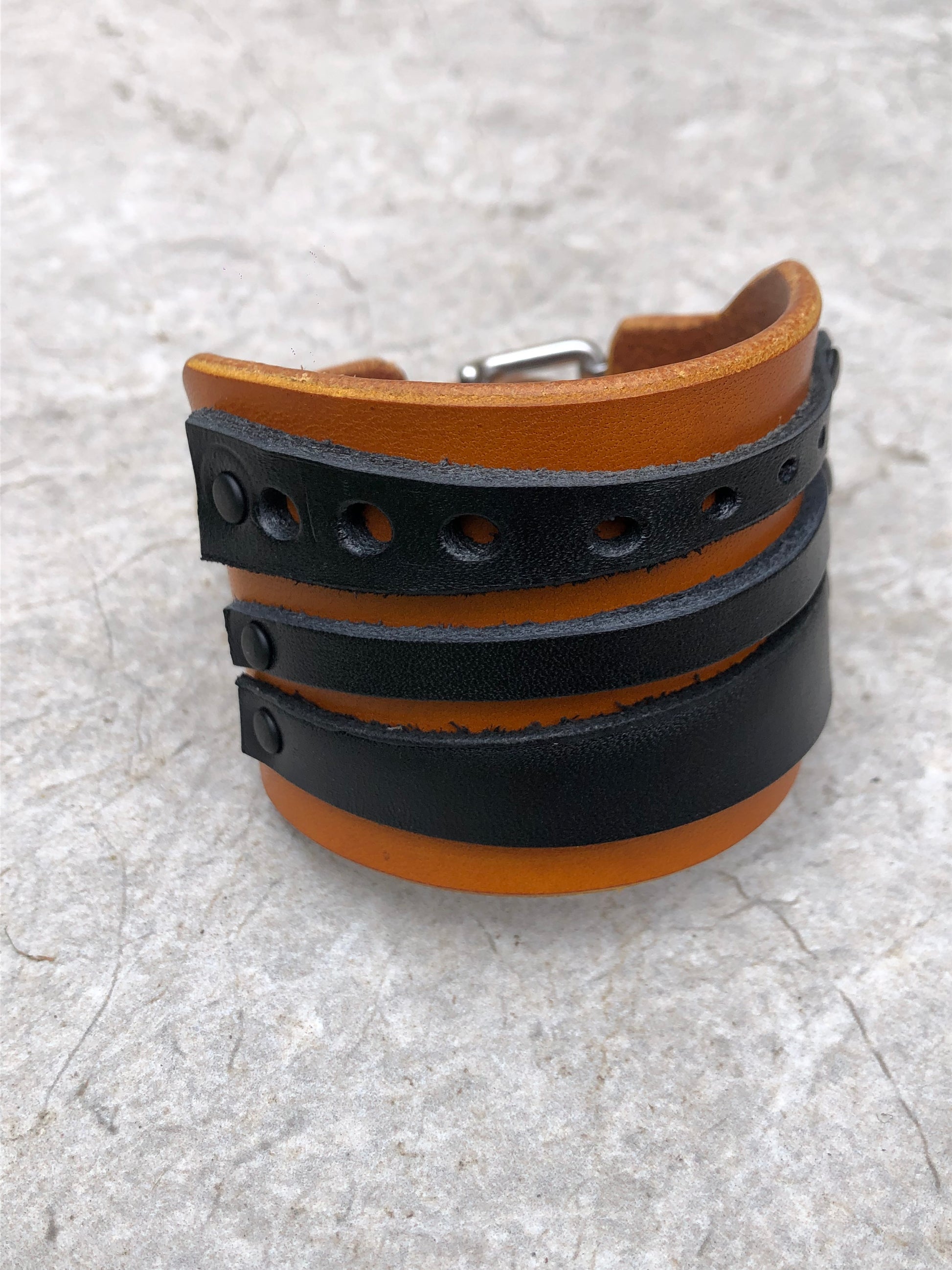 'Tiger' Cuff / Leather Bracelet in Golden Tan and Black. Handmade with premium full grain vegetable tanned Italian leather, solid brass rivets (matt black) and stainless steel buckle. The buckle keeper loop is made of cork leather, so it's very low profile when worn. The Edges are hand burnished with bees wax for a smooth finish. This piece features a bold colour contrast and unique design. Certainly intended to be more of an eye catching statement piece.