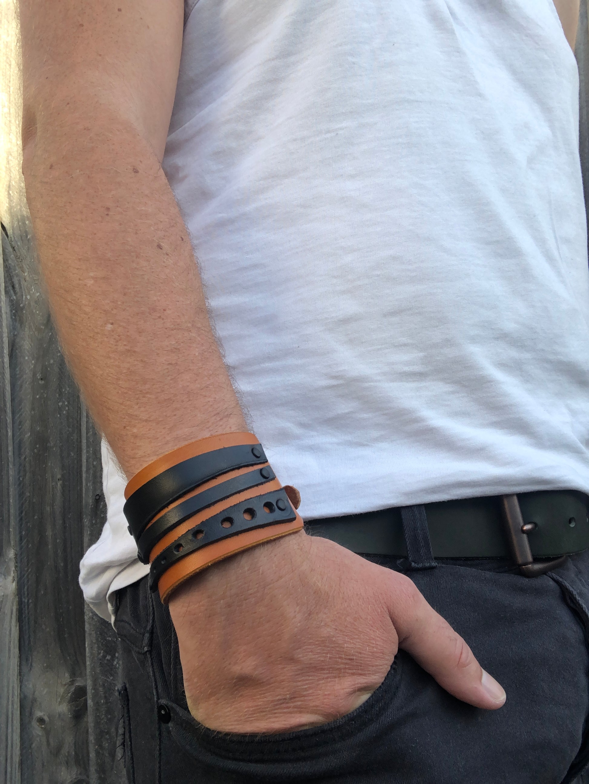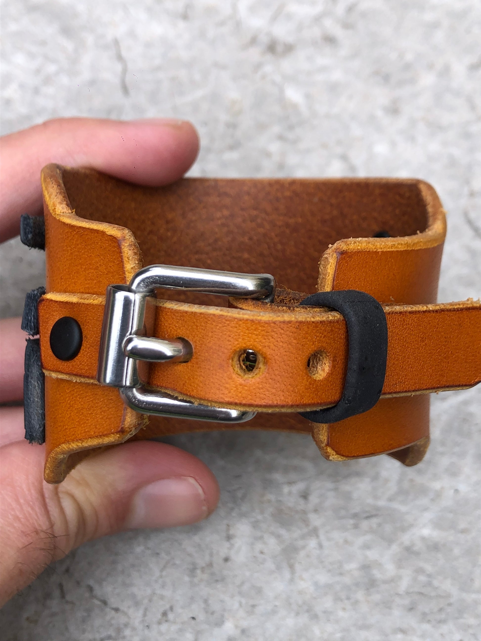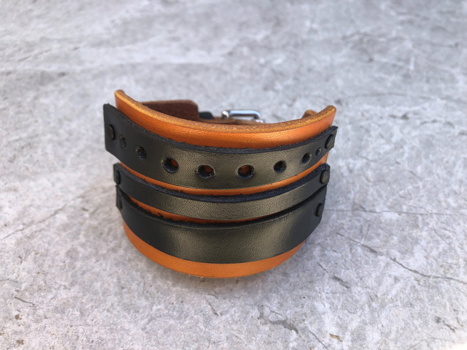 'Tiger' Cuff / Leather Bracelet in Golden Tan and Black. Handmade with premium full grain vegetable tanned Italian leather, solid brass rivets (matt black) and stainless steel buckle. The buckle keeper loop is made of cork leather, so it's very low profile when worn. The Edges are hand burnished with bees wax for a smooth finish. This piece features a bold colour contrast and unique design. Certainly intended to be more of an eye catching statement piece.